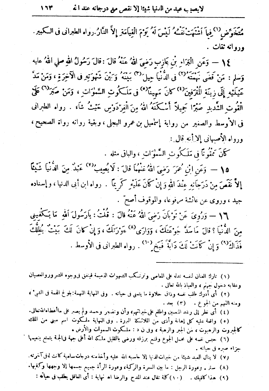 14 - وعَنِ الْبَرَاءِ بْنِ عَازِبٍ رَضِيَ اللهُ عَنْهُ قالَ: قالَ رَسُولُ اللهِ صلى اللهُ عليه وسلم: مَنْ قَضَى نَهْمَتَهُ (¬2) في الدُّنْيَا حِيلَ (¬3) بَيْنَهُ وَبَيْنَ شَهْوَتِهِ في الآخِرَةِ، وَمَنْ مَدَّ عَيْنَيْهِ إِلى زِينَةِ الْمُتْرَفِينَ (¬4) كَانَ مَهِيناً (¬5) في مَلَكُوتِ السَّمَواتِ، وَمَنْ صَبَرَ (¬6) عَلَى الْقُوتِ الشَّدِيدِ صَبْراً جَمِيلاً أَسْكَنَهُ اللهُ مِنَ الْفِرْدَوْسِ حَيْثُ شَاءَ. رواه الطبراني في الأوسط والصغير من رواية إسماعيل بن عمرو البجلي، وبقية رواته رواة الصحيح، ورواه الأصبهاني إلا أنه قال: كَانَ مَمْقُوتاً فِي مَلَكُوتِ السَّمَوَاتِ، والباقي مثله.