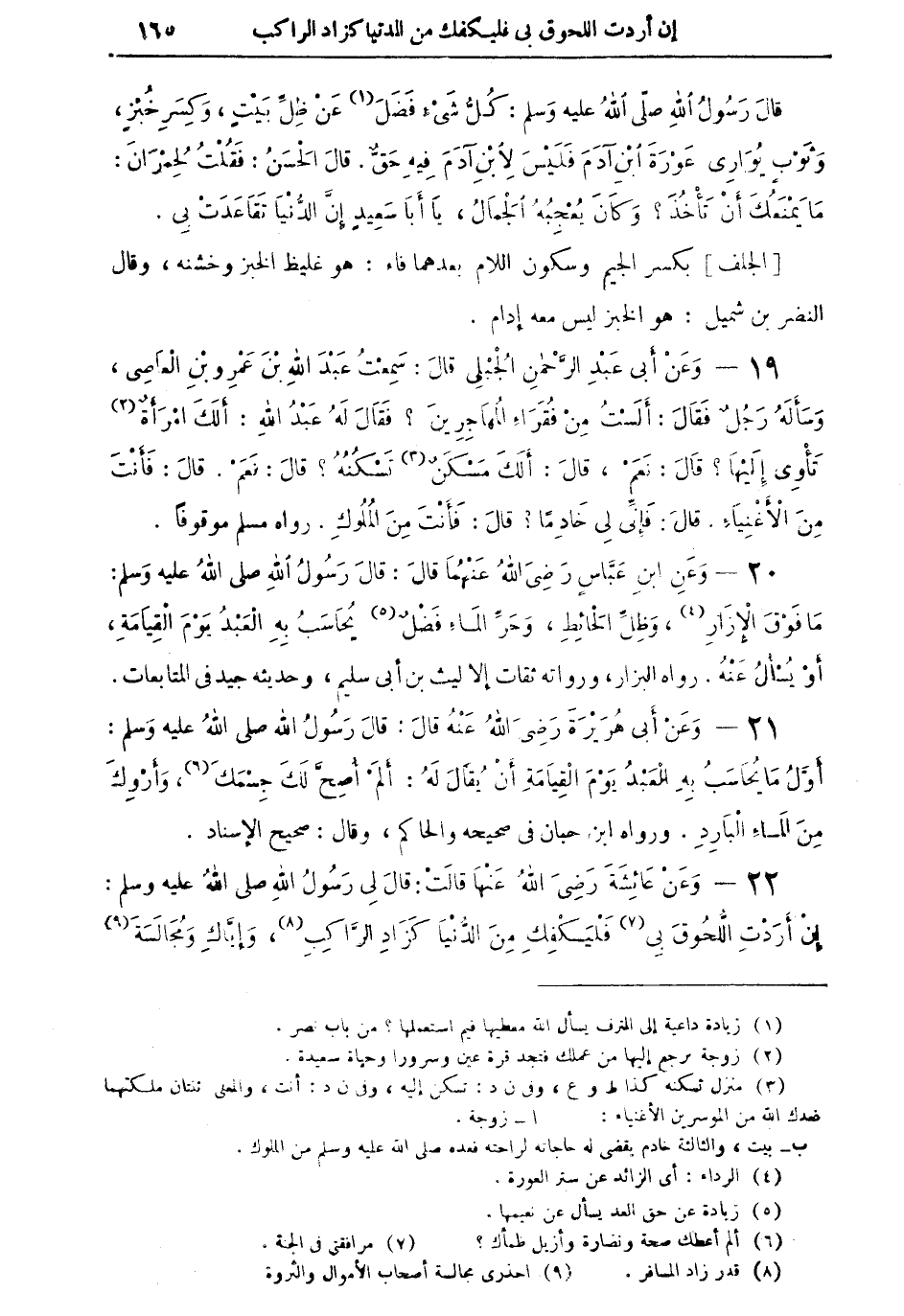 22 - وَعَنْ عَائِشَةَ رَضِيَ اللهُ عَنْهَا قالَتْ: قالَ لِي رَسُولُ الله صلى اللهُ عليه وسلم: إِنْ أَرَدْتِ اللُّحُوقَ بِي (¬7) فَلْيَكْفِكِ مِنَ الدُّنْيَا كَزَادِ الرَّاكِبِ (¬8)، وَإِيَّاكِ وَمُجَالَسَةَ (¬9)