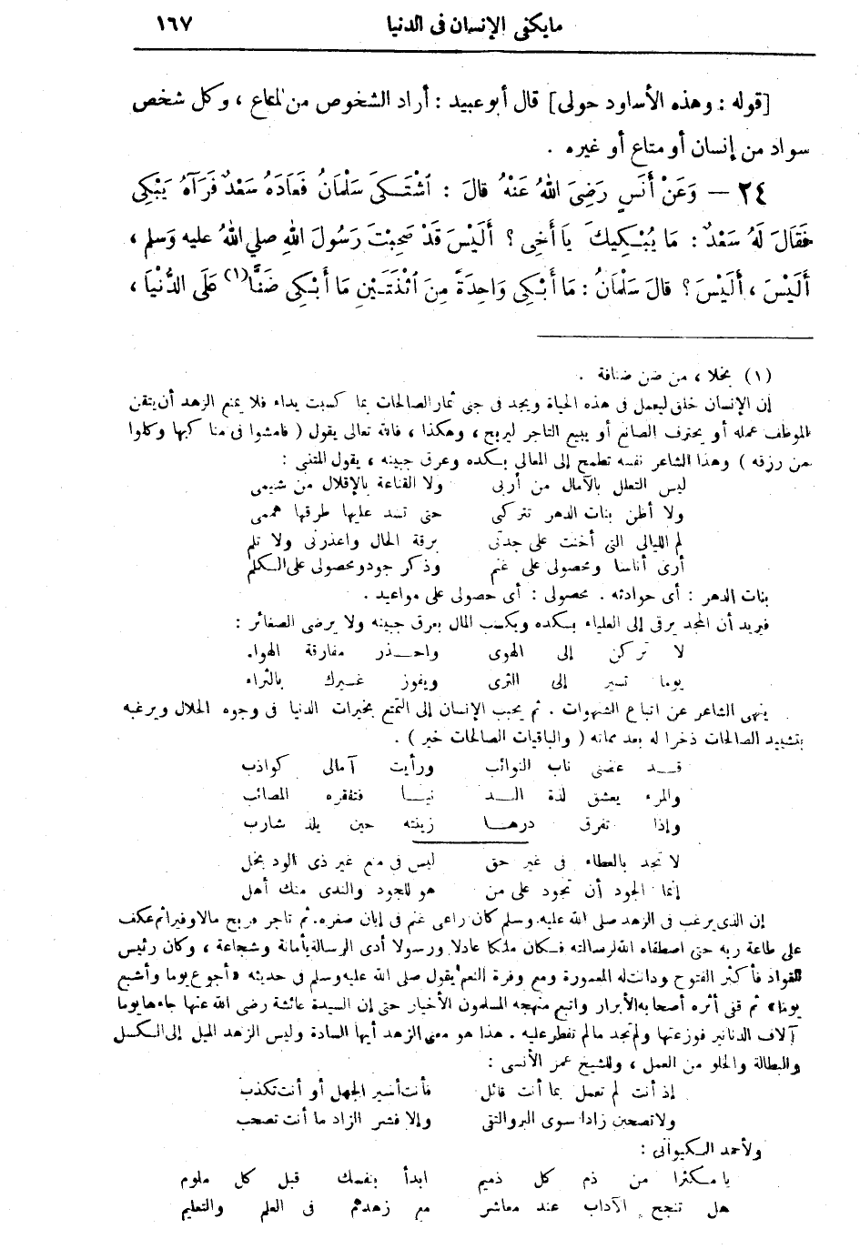 إن الذي يرغب في الزهد صلى الله عليه وسلم كان راعي غنم في إبان صغره. ثم تاجر فربح مالاً وفيراً ثم عكف على طاعة ربه حتى اصطفاه الله لرسالته فكان ملكاً عادلاً ورسولاً أدى الرسالة بأمانة وشجاعة، وكان رئيس القواد فأكثر الفتوح ودانت له المعمورة ومع وفرة النعم يقول صلى الله عليه وسلم في حديثه "أجوع يوماً وأشبع يوماً" ثم قفى أثره أصحابه الأبرار وابتع منهجه المسلمون الأخيار حتى إن السيدة عائشة رضي الله عنها جاءها يوماً آلاف الدنانير فوزعتها ولم تجد ما تفطر عليه. هذا هو معنى الزهد أيها السادة. وليس الزهد الميل إلى الكسل والبطالة والخلو من العمل، وللشيخ عمر الأنسي: