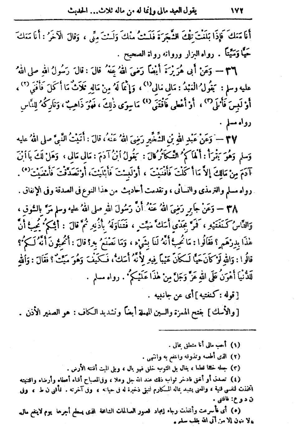 37 - وَعَنْ عَبْدِ اللهِ بْنِ الشِّخِيرِ رَضِيَ اللهُ عَنْهُ، قالَ: أَتَيْتُ النَّبِيَّ صلى اللهُ عليه وسلم، وَهُوَ يَقْرَأُ: أَلْهَاكُمُ التَّكَاثُرُ قالَ: يَقُولُ ابْنُ آدَمَ: مَالِي مَالِي، وَهَلْ لَكَ يَا ابْنَ آدَمَ مِنْ مَالِكَ إِلاَّ مَا أكَلْتَ فَأَفْنَيْتَ، أَوْ لَبِسْتَ فأَبْلَيْتَ، أَوْ تَصَدَّقْتَ فأَمْضَيْتَ (¬5). رواه مسلم والترمذي والنسائي، وتقدم أحاديث من هذا النوع في الصدقة وفي الإنفاق.