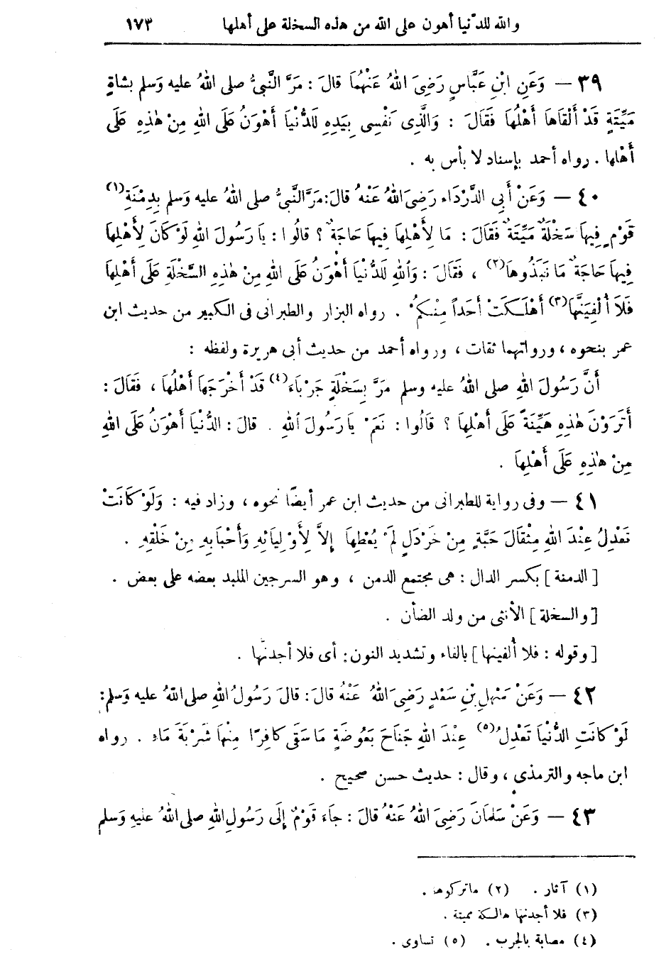 39 - وَعَنِ ابْنِ عَبَّاسٍ رَضِيَ اللهُ عَنْهُمَا قالَ: مَرَّ النَّبِيُّ صلى اللهُ عليه وسلم بِشَاةٍ مَيِّتَةٍ قَدْ أَلْقَاهَا أَهْلُهَا فَقَالَ: وَالَّذِي نَفْسِي بِيَدِهِ لَلدُّنْيَا أَهْوَنُ عَلَى اللهِ مِنْ هَذِهِ عَلَى أَهْلِهَا. رواه أحمد بإسناد لا بأس به.