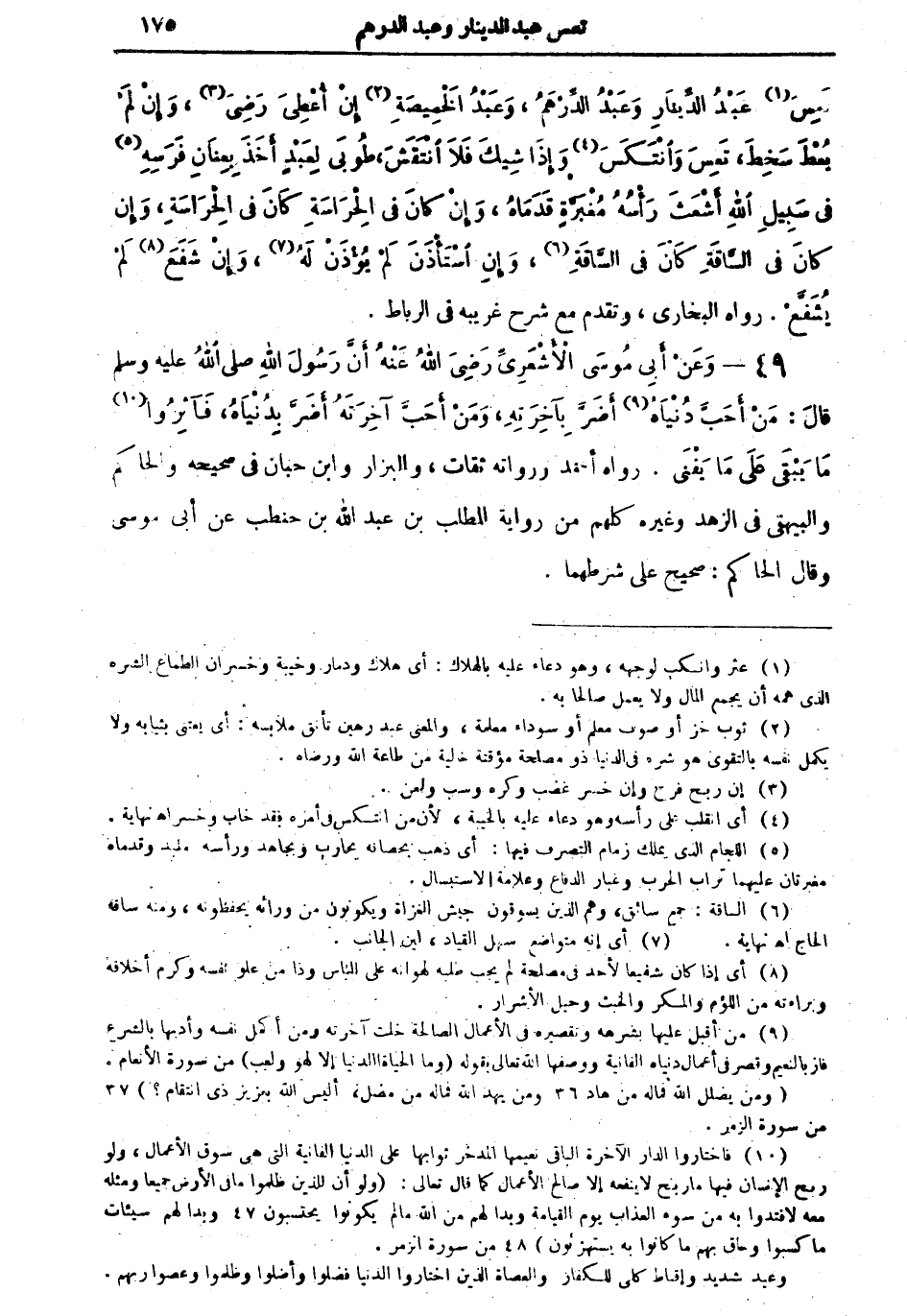49 - وَعَنْ أَبِي مُوسَى الأَشْعَرِيِّ رَضِيَ اللهُ عَنْهُ أَنَّ رَسُولَ اللهِ صلى اللهُ عليه وسلم قالَ: مَنْ أَحَبَّ دُنْيَاهُ (¬9) أَضَرَّ بِآخِرَتِهِ، ومَنْ أَحَبَّ آخِرَتَهُ أَضَرَّ بِدُنْيَاهُ، فَآثِرُوا (¬10) مَا يَبْقَى عَلَى مَا يَفْنى. رواه أحمد ورواته ثقات، والبزار وابن حبان في صحيحه والحاكم والبيهقي في الزهد وغيره، كلهم من رواية المطلب بن عبد الله بن حنطب عن أبي موسى وقال الحاكم: صحيح على شرطهما.