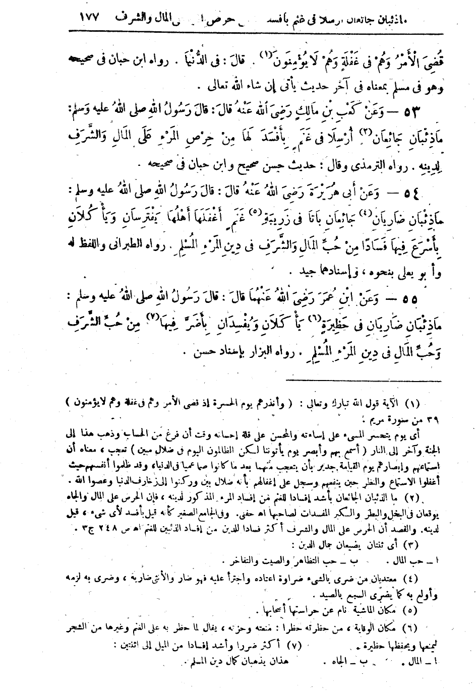 53 - وَعَنْ كَعْبِ بْنِ مَالِكٍ رَضِيَ اللهُ عَنْهُ قالَ: قالَ رَسُولُ اللهِ صلى اللهُ عليه وسلم: مَا ذِئْبَانِ جَائِعَانِ (¬2) أُرْسِلا في غَنَمٍ بِأَفْسَدَ لَهَا مِنْ حِرْصِ الْمَرْءِ عَلى المالِ والشَّرَفِ لِدِينِهِ (¬3). رواه الترمذي وقال: حديث حسن صحيح وابن حبان في صحيحه.