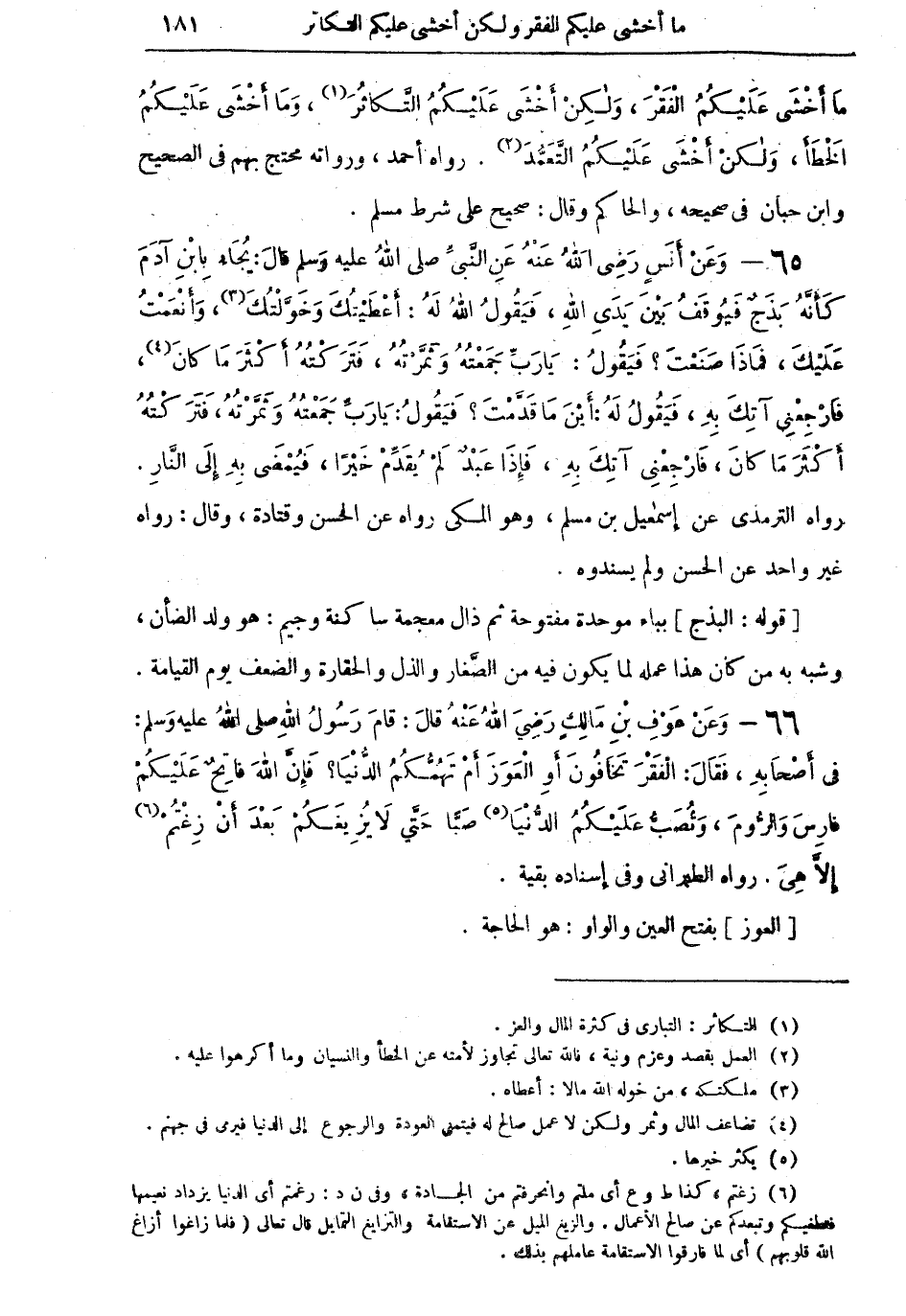 66 - وَعَنْ عَوْفِ بْنِ مَالِكٍ رَضِيَ اللهُ عَنْهُ قالَ: قَامَ رَسُولُ اللهِ صلى اللهُ عليه وسلم في أَصْحَابِهِ، فَقَالَ: الْفَقْرَ تَخَافُونَ أَوِ الْعَوَزَ أَمْ تَهُمُّكُمُ الدُّنْيَا؟ فَإِنَّ اللهَ فَاتِحٌ عَلَيْكُمْ فَارِسَ وَالرُّومَ، وَتُصَبُّ عَلَيْكُمْ الدُّنْيَا (¬5) صَبَّاً حَتَّى لا يُزِيغَكُمْ بَعْدَ أَنْ زِغْتُم (¬6) إِلاَّ هيَ. رواه الطبراني وفي إسناده بقية.