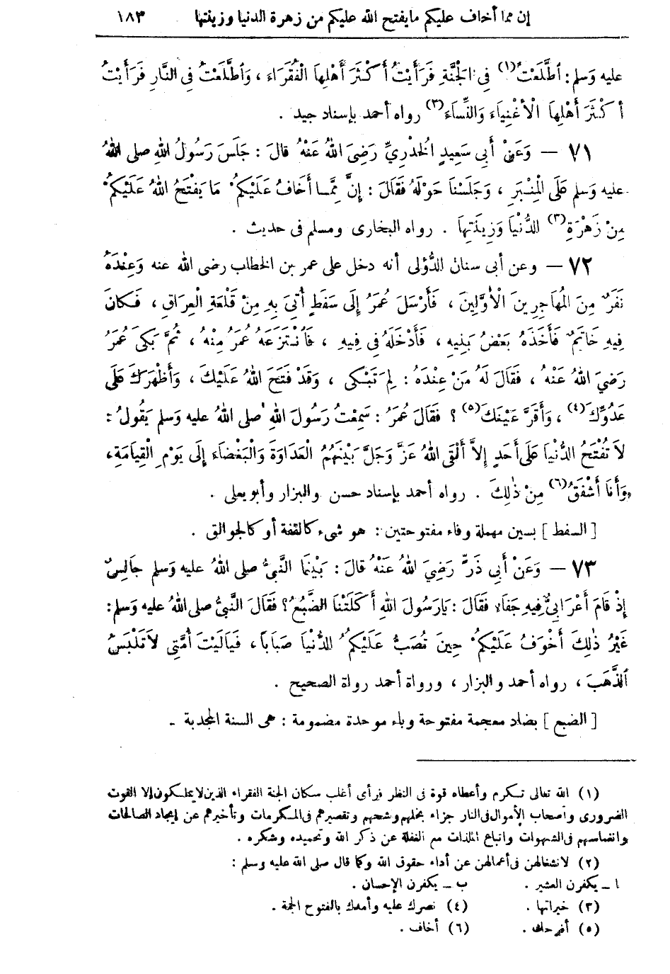 73 - وَعَنْ أَبي ذَرٍّ رَضِيَ اللهُ عَنْهُ قالَ: بَيْنَمَا النَّبِيُّ صلى اللهُ عليه وسلم جَالِسٌ إِذْ قامَ أَعْرَابِيٌّ فِيهِ جَفَاءٌ فَقَالَ: يَا رَسُولَ اللهِ أَكَلَتْنَا الضَّبُعُ؟ فَقَالَ النَّبِيُّ صلى اللهُ عليه وسلم: غَيْرُ ذَلِكَ أَخْوَفُ عَلَيْكُمْ حِينَ تُصَبُّ عَلَيْكُمُ الدُّنْيَا صَبَاباً، فَيَا لَيْتَ أُمَّتِي لاَ تَلْبَسُ الذَّهَبَ، رواه أحمد والبزار، ورواة أحمد رواة الصحيح.