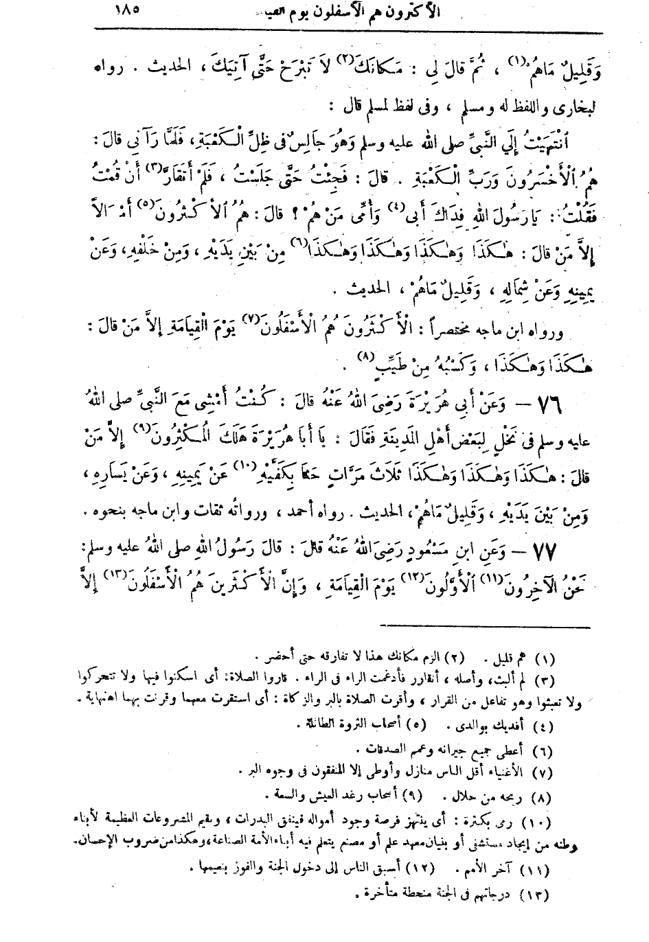 76 - وَعَنْ أَبِي هُرَيْرَةَ رَضِيَ اللهُ عَنْهُ قالَ: كُنْتُ أَمْشِي مَعَ النَّبِيِّ صلى الله عليه وسلم في نَخْلٍ لِبَعْضِ أَهْلِ الْمَدِينَةِ فَقَالَ: يَا أَبَا هُرَيْرَةَ هَلَكَ الْمُكْثِرُونَ (¬9) إِلاَّ مَنْ قالَ: هكَذَا وَهكَذَا وَهكَذَا ثَلاثَ مَرَّاتٍ حَثَا بِكَفَّيْهِ (¬10) عَنْ يَمِينِهِ، وَعَنْ يَسَارِهِ، وَمِنْ بَيْنِ يَدَيْهِ، وَقَلِيلٌ مَا هُم، الحديث. رواه أحمد، ورواتُه ثقات وابن ماجة بنحوه.