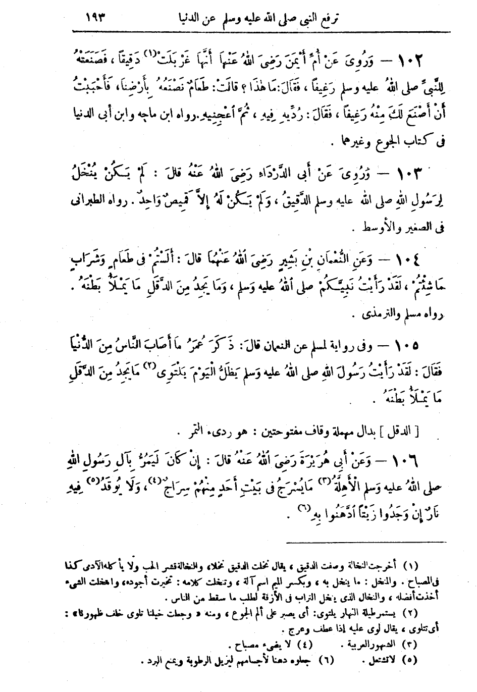 104 - وَعَنِ النُّعْمَانِ بْنِ بَشِيرٍ رَضِيَ اللهُ عَنْهُمَا قالَ: أَلَسْتُمْ في طَعَامٍ وَشَرَابٍ مَا شِئْتُمْ، لَقَدْ رَأَيْتُ نَبِيَّكُمْ صلى اللهُ عليه وسلم، وَمَا يَجِدُ مِنَ الدَّقَلِ مَا يَمْلأُ بَطْنَهُ. رواه مسلم والترمذي.