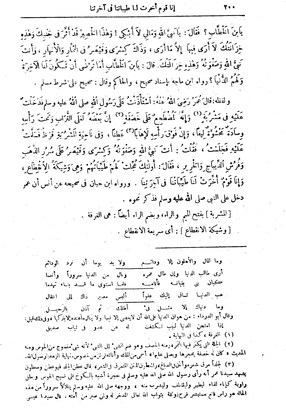 عَطِناً، وَفي نَاحِيَةِ الْمَشْرُبَةِ قَرَظٌ فَسَلَّمْتُ عَلَيْهِ فَجَلَسْتُ، فَقُلْتُ: أَنْتَ نَبِيُّ اللهِ وَصَفْوَتُهُ، وَكِسْرَى وَقَيْصَرُ عَلى سُرُرِ الذَّهَبِ وَفُرشِ الدِّيبَاجِ وَالْحَرِيرِ، فَقَالَ: أُولئِكَ عُجِّلَتْ لَهُمْ طَيِّبَاتُهُمْ وَهِيَ وَشِيكَةُ الانْقِطَاعِ، وَإِنَّا قَوْمٌ أُخِّرَتْ لَنَا طَيِّبَاتُنا في آخِرَتِنَا. رواه ابن حبان في صحيحه عن أنس أن عمر دخل على النبي صلى الله عليه وسلم فذكر نحوه.