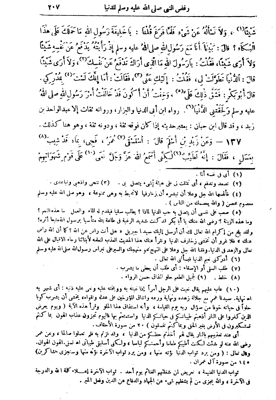 137 - وَعَنْ زَيْدِ بْنِ أَسْلَمَ قالَ: اسْتَسْقَى (¬7) عُمَرُ، فَجِيءَ بِمَاءٍ قَدْ شِيبَ (¬8) بِعَسَلٍ، فَقَالَ: إِنَّهُ لَطَيِّبٌ (¬9) لكِنِّي أَسْمَعُ اللهَ عَزَّ وَجَلَّ نَعَى (¬10) عَلَى قَوْمٍ شَهَوَاتِهِمْ