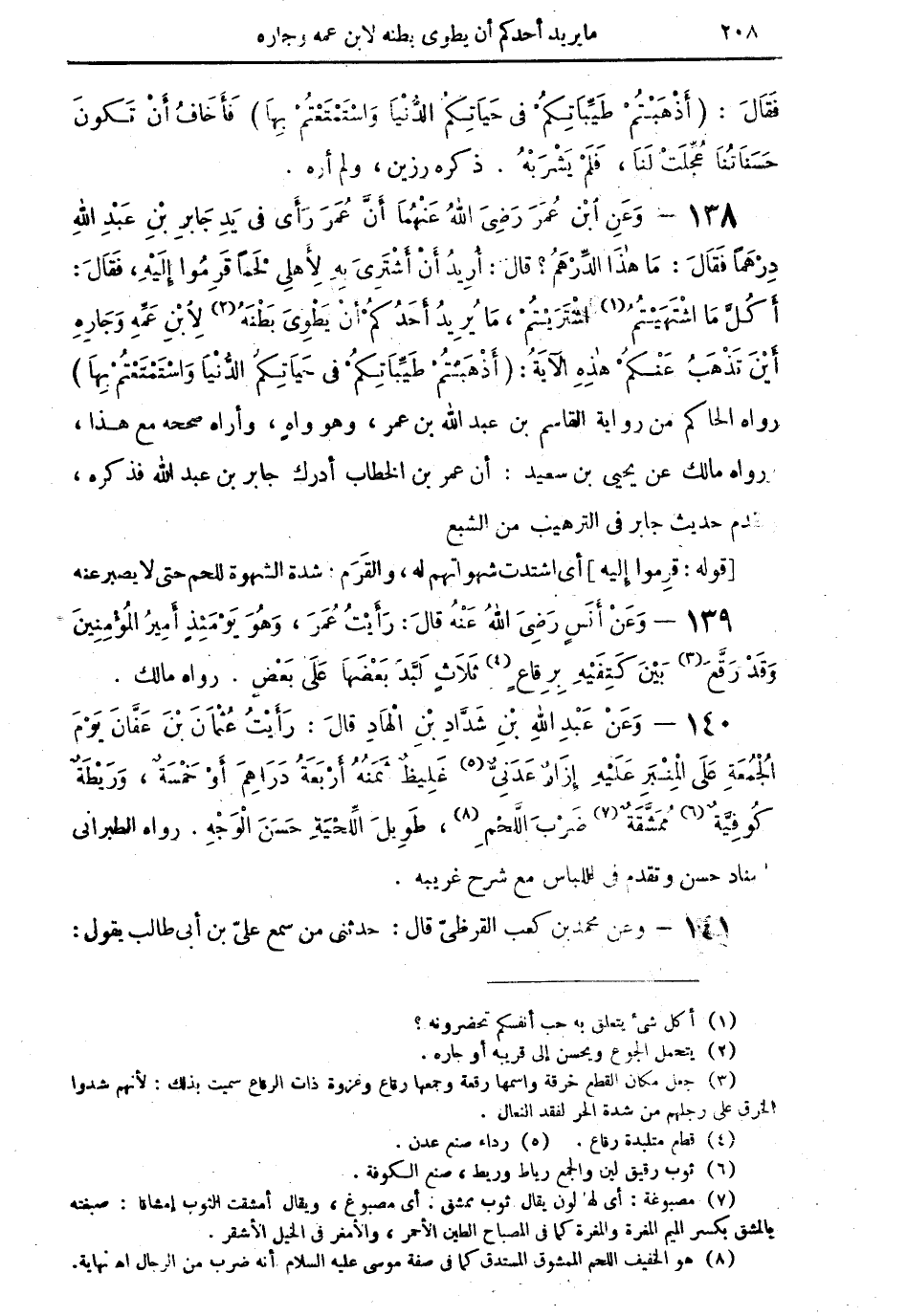 138 - وَعَنِ ابْنِ عُمَرَ رَضِيَ اللهُ عَنْهُما أَنَّ عُمَرَ رَأَى في يَدِ جَابِرِ بْنِ عَبْدِ اللهِ دِرْهَمَاً فَقَالَ: مَا هذَا الدِّرْهَمُ؟ قالَ: أُرِيدُ أَنْ أَشْتَرِيَ بِهِ لأَهْلِي لَحْماً قَرِمُوا إِلَيْهِ، فَقَالَ: أَكُلَّ مَا اشْتَهَيْتُمْ (¬1) اشْتَرَيْتُمْ، مَا يُرِيدُ أَحَدُكُمْ أَنْ يَطْوِيَ بَطْنَهُ (¬2) لابْنِ عَمِّهِ وَجَارِهِ أَيْنَ تَذْهَبُ عَنْكُمْ هذِهِ الآيَةُ: [أَذَهَبْتُمْ طَيِّبَاتِكُمْ في حَيَاتِكُمُ الدُّنْيَا واسْتَمْتَعْتُمْ بِهَا] رواه الحاكم من رواية القاسم بن عبد الله بن عمر، وهو واهٍ، وأراه صححه مع هذا، ورواه مالك عن يحيى بن سعيد: أن عمر بن الخطاب أدرك جابر بن عبد الله فذكره، وتقدم حديث جابر في الترهيب من الشبع.