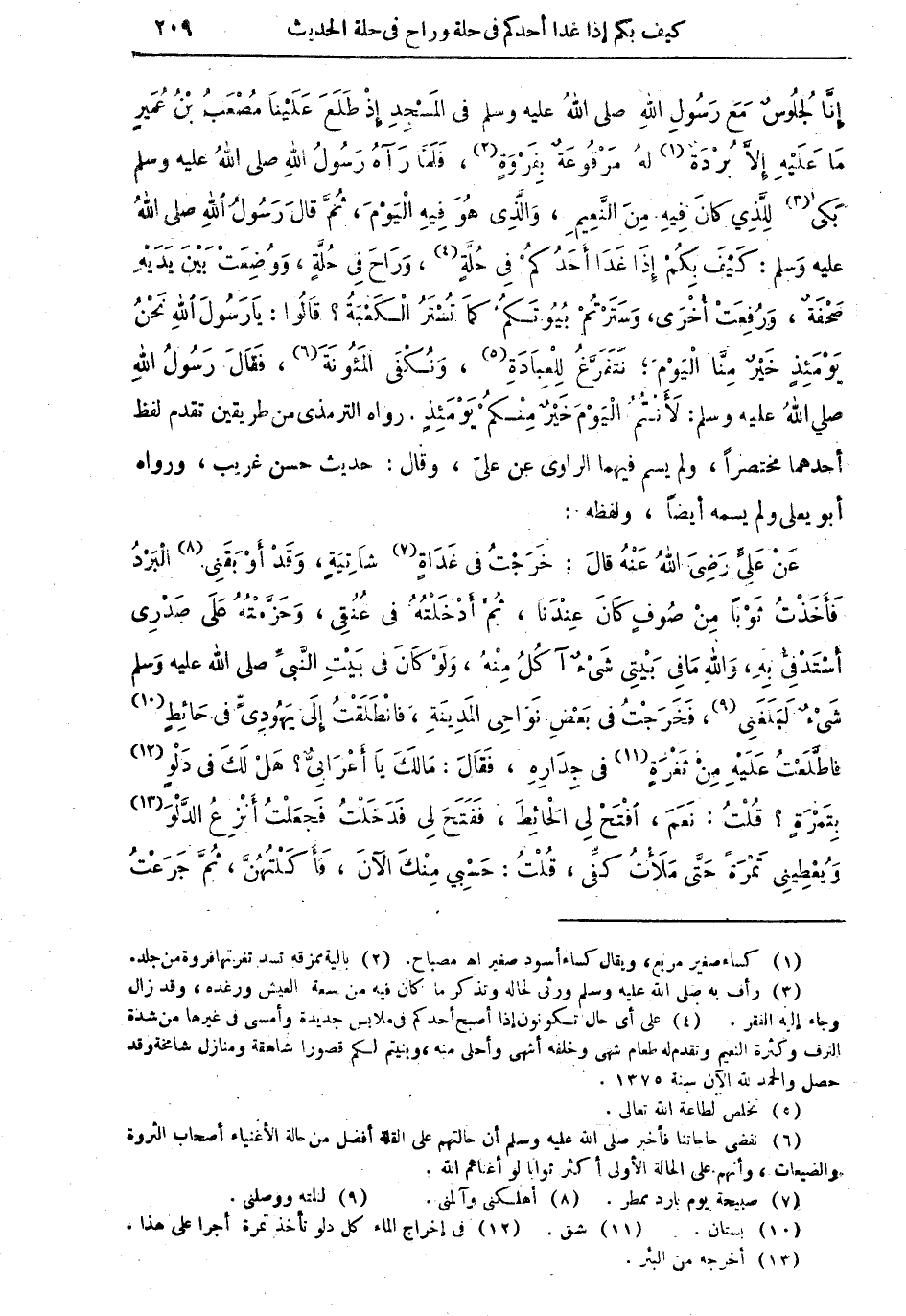 إِنَّا لَجُلوسٌ مَعَ رِسُولِ اللهِ صلى اللهُ عليه وسلم في المسْجِد إِذْ طَلَعَ عَلَيْنَا مُصْعَبُ بْنُ عُمَيْرٍ مَا عَلَيْهِ إِلاّ بُرْدَةٌ (¬1) لَهُ مَرْقُوعَةٌ بِفَرْوَةٍ (¬2)، فَلَمّا رَآهُ رَسُولُ اللهِ صلى اللهُ عليه وسلم بَكَى (¬3) لِلَّذِي كَانَ فِيهِ مِنَ النَّعِيمِ، وَالَّذِي هُوَ فِيهِ الْيَوْمَ. ثُمَّ قَالَ رَسُولُ اللهِ صلى اللهُ عليه وسلم: كَيْفَ بِكُمْ إِذَا غَدَا أَحَدُكُمْ فِي حُلَّةٍ (¬4)، وَرَاحَ فِي حُلَّة، وَوُضِعَتْ بَيْنَ يَدَيْهِ صَحْفَةٌ، وَرُفِعَتْ أُخْرَى، وَسَتَرْتُمْ بُيُوتَكُمْ كَمَا تُسْتَرُ الْكَعْبَةُ؟ قالَوا: يَا رَسُولَ اللهِ نَحْنُ يَوْمَئِذٍ خَيْرٌ مِنَّا الْيَوْمَ: نَتَفَرَّغُ لِلْعِبَادَةِ (¬5)، وَنُكْفَى الْمَؤُونَةَ (¬6)، فَقَالَ رَسُولُ اللهِ صلى اللهُ عليه وسلم: لأَنْتُمْ الْيَوْمَ خَيْرٌ مِنْكُمْ يَوْمَئِذٍ. رواه الترمذي من طريقين تقدم لفظ أحدهما مختصراً، ولم يسم فيهما الراوي عن عليّ، وقال: حديث حسن غريب، ورواه أبو يعلى ولم يسمه أيضاً، ولفظه:
