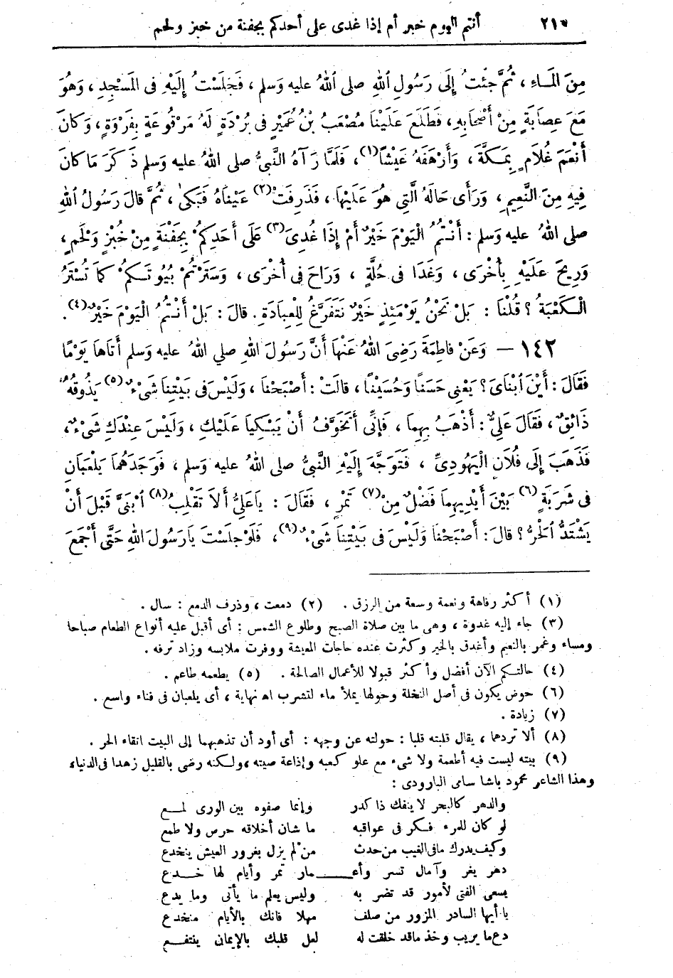 (¬9) بيته ليست فيه أطعمة ولا شيء مع علو كعبه وإذاعة صيته، ولكنه رضي بالقليل زهداً في الدنيا. وهذا الشاعر محمود باشا سامي البارودي: