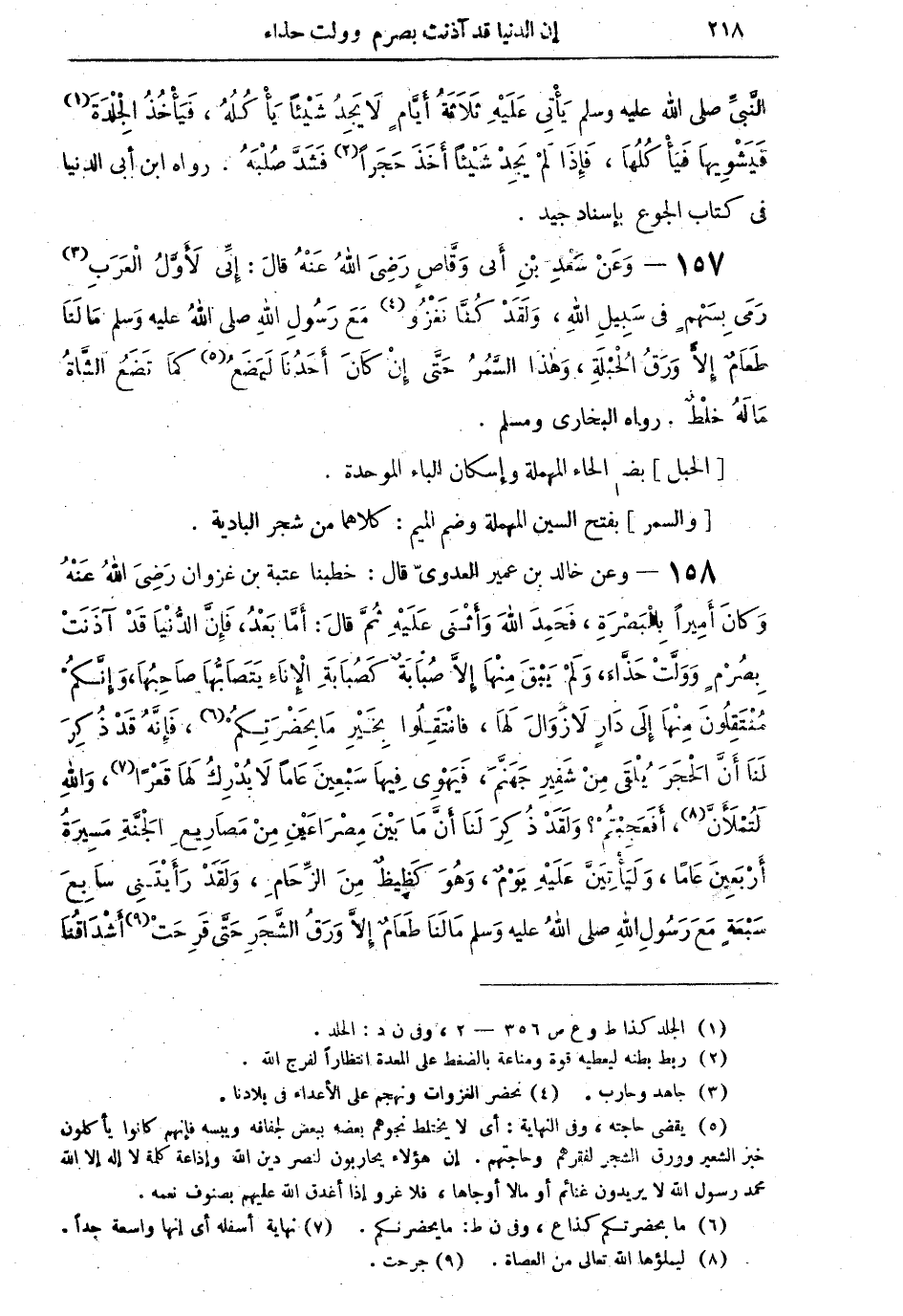 158 - وعن خالد بن عمير العدويّ قال: خطبنا عتبة بن غزوان رَضِيَ اللهُ عَنْهُ وَكَانَ أَمِيراً بِالْبَصْرَةِ، فَحَمِدَ اللهَ وَأَثْنَى عَلَيْهِ ثُمَّ قالَ: أَمَّا بَعْدُ، فَإِنَّ الدُّنْيَا قَدْ آذَنَتْ بصُرْمٍ وَوَلَّتْ حَذَّاءَ، وَلَمْ يَبْقَ مِنْهَا إِلاَّ صُبَابَةٌ كَصُبَابَةِ الإِنَاءِ يَتَصَابُّهَا صَاحِبُهَا، وَإِنَّكُمْ مُنْتَقِلُونَ مِنْهَا إِلى دَارٍ لاَ زَوَالَ لَهَا، فَانْتَقِلُوا بِخَيْرِ مَا بِحَضْرَتِكُمْ (¬6)، فَإِنَّهُ قَدْ ذُكِرَ لَنَا أَنَّ الْحَجَرَ يُلْقَى مِنْ شَفِيرِ جَهَنَّمَ، فَيَهْوِي فِيها سَبْعِينَ عَامَاً لاَ يُدْرِكُ لَهَا قَعْراً (¬7)، وَاللهِ لَتُمْلأَنَّ (¬8)، أَفَعَجِبْتُمْ؟ وَلَقَدْ ذُكِرَ لَنَا أَنَّ مَا بَيْنَ مِصْرَاعِينِ مِنْ مَصَارِيعِ الْجَنَّةِ مَسِيرَةُ أَرْبَعِيْنَ عَاماً، وَلَيَأْتِيَنَّ عَلَيْهِ يَوْمٌ، وَهُوَ كَظِيظٌ مِنَ الزِّحَامِ، وَلَقَدْ رأَيْتُنِي سَابِعَ سَبْعَةٍ مَعَ رَسُولِ اللهِ صلى اللهُ عليه وسلم مَا لَنَا طَعَامٌ إِلاَّ وَرَقُ الشَّجَرِ حَتَّى قَرِحَتْ (¬9) أَشْدَاقُنَا