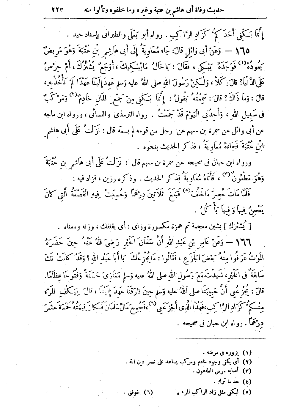 165 - وَعَنْ أَبِي وَائِلٍ قالَ: جَاءَ مُعَاوِيَةُ إِلى أَبِي هَاشِمِ بْنِ عُتْبَةَ وَهُوَ مَرِيضٌ يَعُودُهُ (¬1) فَوَجَدَهُ يَبْكِي، فَقَالَ: يَا خَالُ مَا يُبْكِيكَ، أَوَجِعٌ يُشْئِزُكَ أَمْ حِرْصٌ عَلَى الدُّنْيَا؟ قالَ: كَلاَّ، وَلكِنَّ رَسُولَ اللهِ صلى اللهُ عليه وسلم عَهِدَ إِلَيْنَا عَهْداً لَمْ نَأْخُذْ بِهِ، قالَ: وَمَا ذَاكَ؟ قَالَ: سَمِعْتُهُ يَقُولُ: إِنَّمَا يَكْفِي مِنْ جَمْعِ الْمَالِ خَادِمٌ (¬2) وَمرْكَبٌ فِي سَبِيلِ اللهِ، وَأَجِدُنِي الْيَوْمَ قَدْ جَمَعْتُ. رواه الترمذي والنسائي، ورواه ابن ماجة عن أبي وائل عن سمرة بن سهم عن رجل من قومه لم يسمّه، قال: نَزَلْتُ على أَبِي هَاشِمِ بْنِ عُتْبَةَ فَجَاءَهُ مُعَاويَةُ، فذكر الحديث بنحوه.