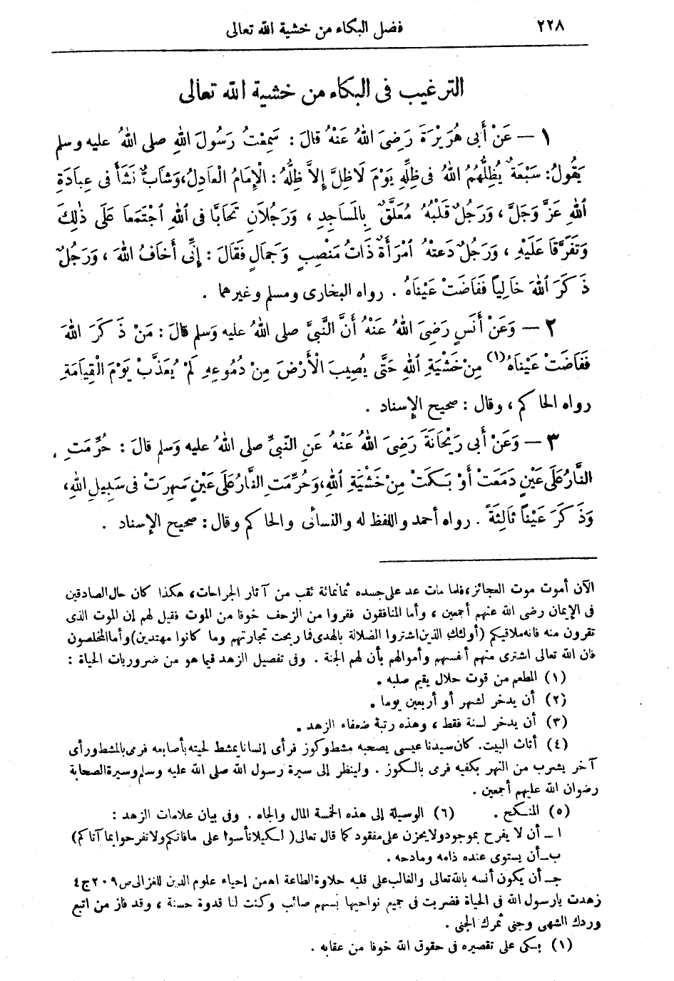 1 - عَنْ أَبِي هُرَيْرَةَ رَضِيَ اللهُ عَنْهُ قالَ: سَمِعْتُ رَسُولَ اللهِ صلى اللهُ عليه وسلم يَقُولُ: سَبْعَةٌ يُظِلهُمُ اللهُ في ظِلِّهِ يَوْمَ لاَ ظِلَّ إِلاَّ ظِلُّهُ: الإِمَامُ الْعَادِلُ، وَشَابٌّ نَشَأَ في عِبَادَةِ اللهِ عَزَّ وَجَلَّ، وَرَجُلٌ قَلْبُهُ مُعَلَّقٌ بِالْمَسَاجِدِ، وَرَجُلاَنِ تَحَابَّا في اللهِ اجْتَمَعَا عَلَى ذَلِكَ وَتَفَرَّقَا عَلَيْهِ، وَرَجُلٌ دَعَتْهُ امْرَأَةٌ ذَاتُ مَنْصِبٍ وَجَمَالٍ فَقَالَ: إِنِّي أَخَافُ اللهَ، وَرَجُلٌ ذَكَرَ اللهَ خَالِياً فَفَاضَتْ عَيْنَاهُ. رواه البخاري ومسلم وغيرهما.