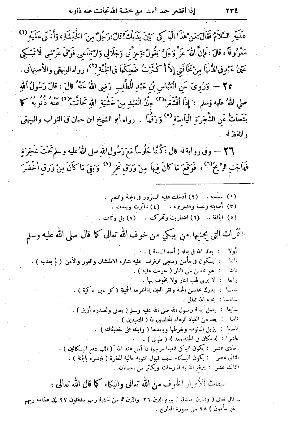 25 - وَرُوِيَ عَنِ الْعَبَّاسِ بْنِ عَبْدِ الْمُطَّلِبِ رَضِيَ اللهُ عَنْهُ قالَ: قالَ رَسُولُ اللهِ صلى اللهُ عليه وسلم: إِذَا اقْشَعَرَّ (¬3) جِلْدُ الْعَبْدِ مِنْ خَشْيَةِ اللهِ تَحَاتَّتْ (¬4) عَنْهُ ذُنُوبُهُ كما يَتَحاتُّ عَنِ الشَّجَرَةِ الْيَابِسَةِ (¬5) وَرَقُهَا. رواه أبو الشيخ ابن حبان في الثواب والبيهقي واللفظ له.
