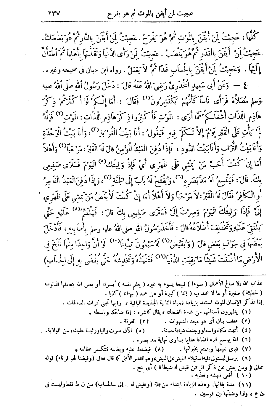 كُلُّهَا: عَجِبْتُ لِمَنْ أَيْقَنَ بِالْمَوْتِ ثُمَّ هُوَ يَفْرَحُ. عَجبْتُ لِمَنْ أَيْقَنَ بِالنَّارِ ثُمَّ هُوَ يَضْحَكُ عَجِبْتُ لِمَنْ أَيْقَنَ بِالْقَدَرِ ثُمَّ هُوَ يَنْصَبُ. عَجِبْتُ لِمَنْ رَأَى الدُّنْيَا وَتَقَلُّبِهَا بِأَهْلِهَا ثُمَّ اطْمَأَنَّ إِلَيْهَا. وَعَجِبْتُ لِمَنْ أَيْقَنَ بِالْحِسَابِ غَداً ثُمَّ لاَ يَعْمَلُ. رواه ابن حبان في صحيحه وغيرُه.