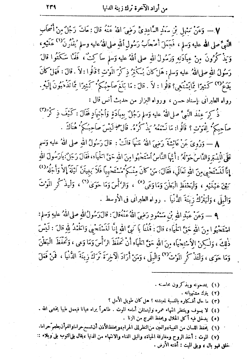 7 - وَعَنْ سَهْلِ بْنِ سَعْدٍ السَّاعِدِيِّ رَضِيَ اللهُ عَنْهُ قالَ: مَاتَ رَجُلٌ مِنْ أَصْحَابِ النَّبِيِّ صلى اللهُ عليه وسلم، فَجَعَلَ أَصْحَابُ رَسُولِ اللهِ صلى اللهُ عليه وسلم يُثنُونَ (¬1) عَلَيْهِ، وَيَذْكُرُونَ مِنْ عِبَادَتِهِ وَرَسُولُ اللهِ صلى اللهُ عليه وسلم سَاكِتٌ، فَلَمَّا سَكَتُوا قالَ رَسُولُ اللهِ صلى اللهُ عليه وسلم: هَلْ كَانَ يُكْثِرُ ذِكْرَ الْمَوتِ؟ قَالُوا: لاَ. قالَ: فَهَلْ كَانَ يَدَعُ (¬2) كَثِيراً مِمَّا يَشْتَهِي؟ قالُوا: لاَ. قالَ: مَا بَلَغَ صَاحِبُكُمْ كَثِيراً مِمَّا تَذْهَبُونَ إِلَيْهِ.
