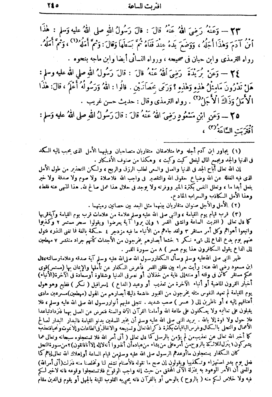 25 - وَعَنِ ابْنِ مَسْعُودٍ رَضِيَ اللهُ عَنْهُ قالَ: قالَ رَسُولُ اللهِ صلى اللهُ عليه وسلم: اقْتَرَبَتِ السَّاعَةُ (¬3)،
