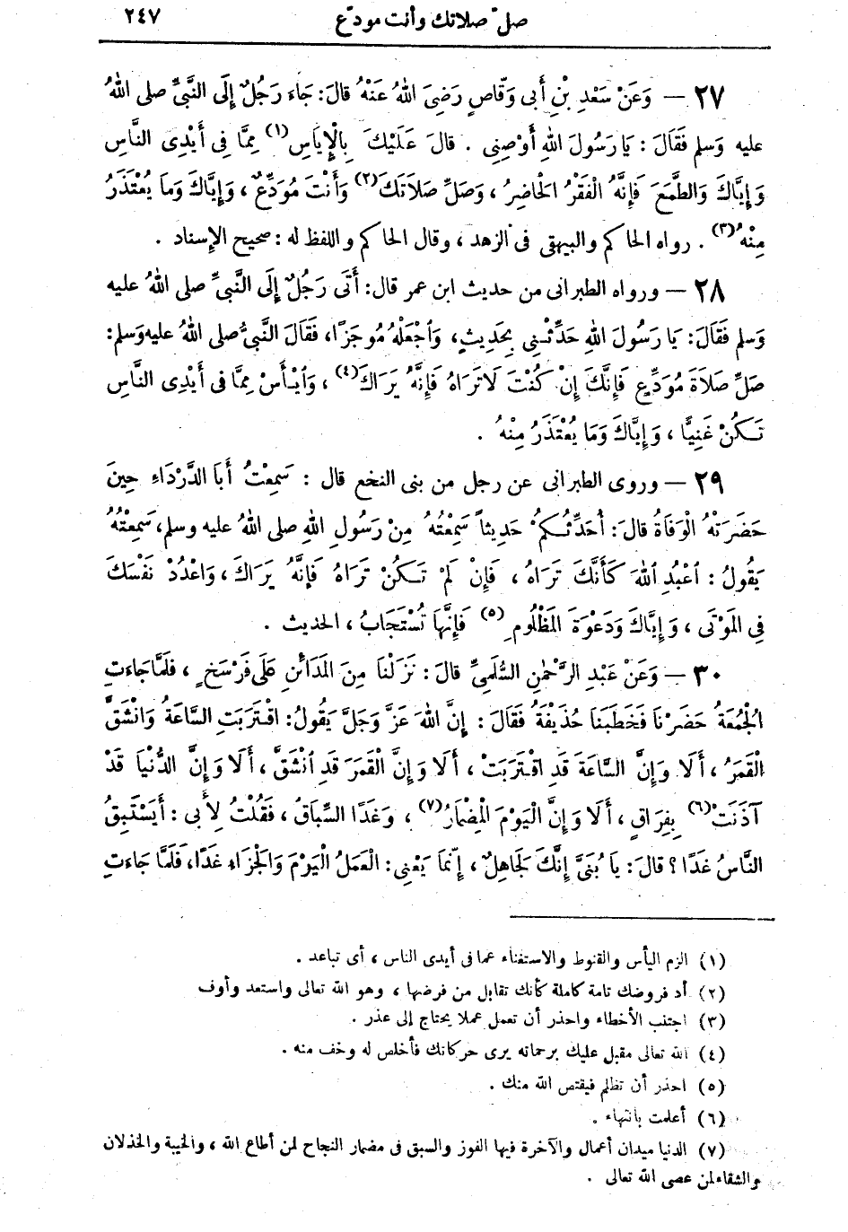 27 - وَعَنْ سَعْدِ بْنِ أَبِي وَقَّاصٍ رَضِيَ اللهُ عَنْهُ قالَ: جَاءَ رَجُلٌ إِلى النَّبِيِّ صلى اللهُ عليه وسلم فَقَالَ: يَا رَسُولَ اللهِ أَوْصِني. قالَ: عَلَيْكَ بالإِيَاسِ (¬1) مِمَّا في أَيْدِي النَّاسِ وَإِيَّاكَ والطَّمَعَ فَإِنَّهُ الْفَقْرُ الْحَاضِرُ، وَصَلِّ صَلاَتَكَ (¬2) وَأَنْتَ مُوَدِّعٌ، وَإِيَّاكَ وَمَا يُعْتَذَرُ مِنْهُ (¬3). رواه الحاكم والبيهقي في الزهد، وقال الحاكم واللفظ له: صحيح الإسناد.