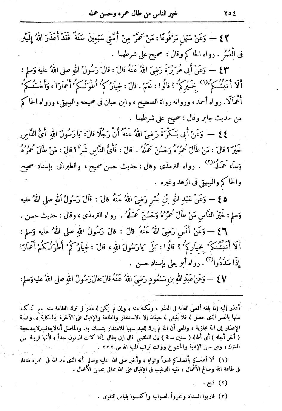 43 - وَعَنْ أَبِي هُرَيْرَةَ رَضِيَ اللهُ عَنْهُ قالَ: قالَ رَسُولُ اللهِ صلى اللهُ عليه وسلم: أَلاَ أُنَبِّؤُكُمْ (¬1) بِخَيْرِكُمْ؟ قالُوا: نَعَمْ. قالَ: خِيَارُكُمْ أَطْوَلُكُمْ أَعْمَاراً، وَأَحْسَنُكُمْ أَعْمَالاً. رواه أحمد، ورواته رواة الصحيح، وابن حبان في صحيحه والبيهقي، ورواه الحاكم من حديث جابر وقال: صحيح على شرطهما.