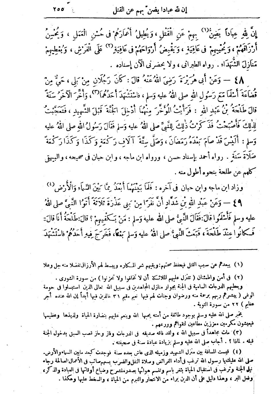 48 - وَعَنْ أَبِي هُرَيْرَةَ رَضِيَ اللهُ عَنْهُ قالَ: كَانَ رَجُلانِ مِنْ بَلي، حَيٌّ مِنْ قُضَاعَةَ أَسْلَمَا مَعَ رَسُولِ اللهِ صلى اللهُ عليه وسلم، فاسْتَشْهَدَ أَحَدُهُمَا (¬3)، وَأُخِّرَ الآخَرُ سَنَةً قالَ طَلْحَةُ بْنُ عَبْدِ اللهِ: فَرَأَيْتُ الْمُؤَخَّرَ مِنْهُمَا أُدْخِلَ الْجَنَّةَ قَبْلَ الشَّهِيدِ، فَتَعَجَّبْتُ لِذلِكَ فأَصْبَحْتُ فَذَكَرْتُ ذَلِكَ لِلنَّبِيِّ صلى اللهُ عليه وسلم فَقَالَ رَسُولُ اللهِ صلى اللهُ عليه وسلم: أَلَيْسَ قَدْ صَامَ بَعْدَهُ رَمَضَانَ، وَصَلَّى سِتَّةَ آلافِ رَكْعَةٍ وَكَذَا وَكَذَا رَكْعَةً صَلاةَ سَنَةٍ رواه أحمد بإسناد حسن، ورواه ابن ماجة وابن حبان في صحيحه والبيهقي كلهم عن طلحة بنحوه أطول منه،