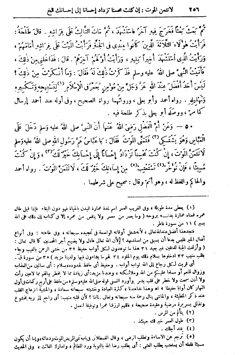 50 - وَعَنْ أُمِّ الْفَضْلِ رَضِيَ اللهُ عَنْهَا أَنَّ النَّبِيَّ صلى اللهُ عليه وسلم دَخَلَ عَلَى الْعَبَّاسِ وَهُوَ يَشْتَكِي (¬2) فَتَمَنَّى الموْتَ فَقَالَ: يَا عَبَّاسُ عَمَّ رَسُولِ اللهِ صلى اللهُ عليه وسلم لاَ تَتَمَنَّ الْمَوْتَ إِنْ كُنْتَ مُحْسِناً تَزْدَادُ إِحْسَاناً إِلى إِحْسَانِكَ خَيْرٌ لَكَ (¬3)، وَإِنْ كُنْتَ مُسِيئاً، فَإِنْ تُؤَخَّرْ (¬4) تَسْتَعْتِبْ (¬5) مِنْ إِسَاءَتِكَ خَيْرٌ لَكَ، لاَ تَتَمَنَّ الْمَوْتَ. رواه أحمد والحاكم واللفظ له، وهو أتمّ وقال: صحيح على شرطهما.