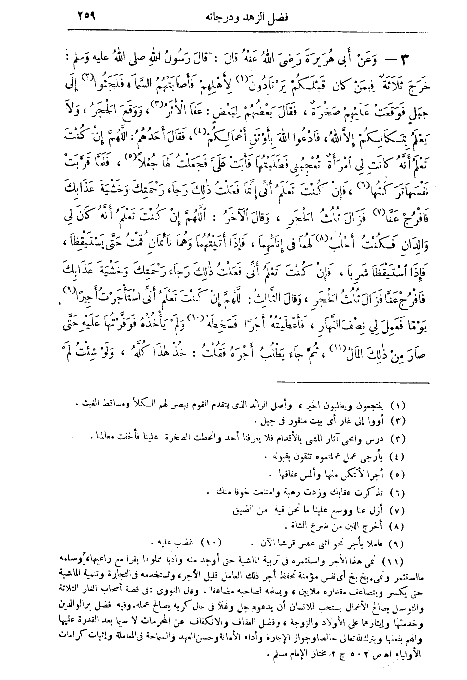 (¬11) نمى هذا الأجر واستثمره في تربية الماشية حتى أوجد منه وادياً مملوءاً بقراً مع راعيها، وسلمه ما استثمر ونمى. بخ بخ أي نفس مؤمنة تحفظ أجر ذلك العامل قليل الأجر، وتستخدمه في التجارة وتنمية الماشية حتى يكثر ويتضاعف مقداره ملايين، ويسلمه لصاحبه مضاعفاً. وقال النووي: في قصة أصحاب الغار الثلاثة والتوسل بصالح الأعمال يستحب للإنسان أن يدعوه جل وعلا في حال كربه بصالح عمله. وفيه فضل بر الوالدين وخدمتهما وإيثارهما على الأولاد والزوجة، وفضل العفاف والانكفاف عن المحرمات لا سيما بعد القدرة عليها والهم بفعلها ويترك لله تعالى خالصاً وجواز الإجازة وأداء الأمانة وحسن العهد والسماحة في المعاملة وإثبات كرامات الأولياء أهـ ص 502 جـ 2 مختار الإمام مسلم.