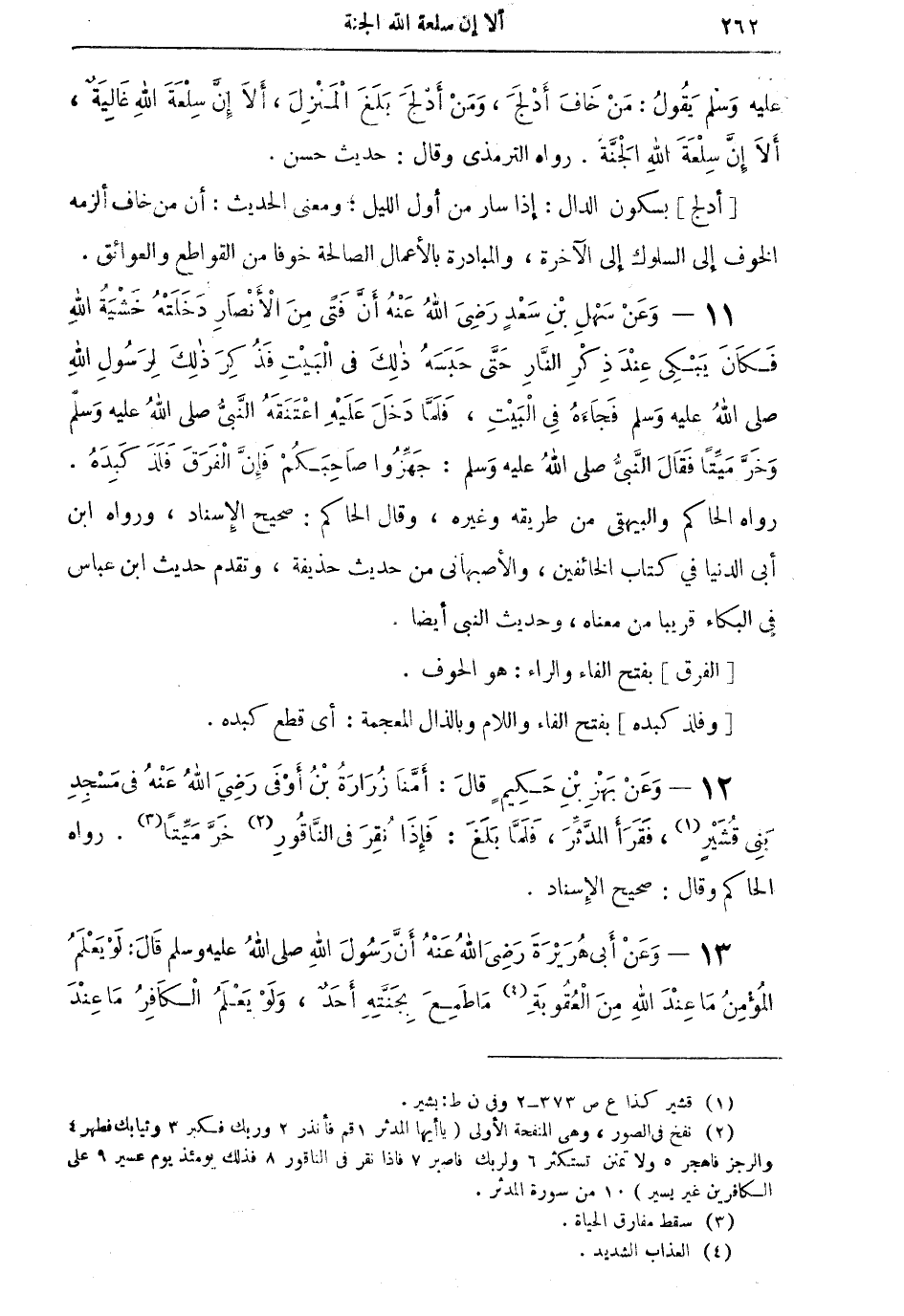 13 - وَعَنْ أَبي هَرَيْرَةَ رَضِيَ اللهُ عَنْهُ أَنَّ رَسُولَ اللهِ صلى اللهُ عليه وسلم قالَ: لَوْ يَعْلَمُ الْمُؤْمِنُ مَا عِنْدَ اللهِ مِنْ الْعُقُوبَةِ (¬4) مَا طَمِعَ بِجَنَّتِهِ أَحَدٌ، وَلَوْ يَعْلَمُ الْكَافِرُ مَا عِنْدَ