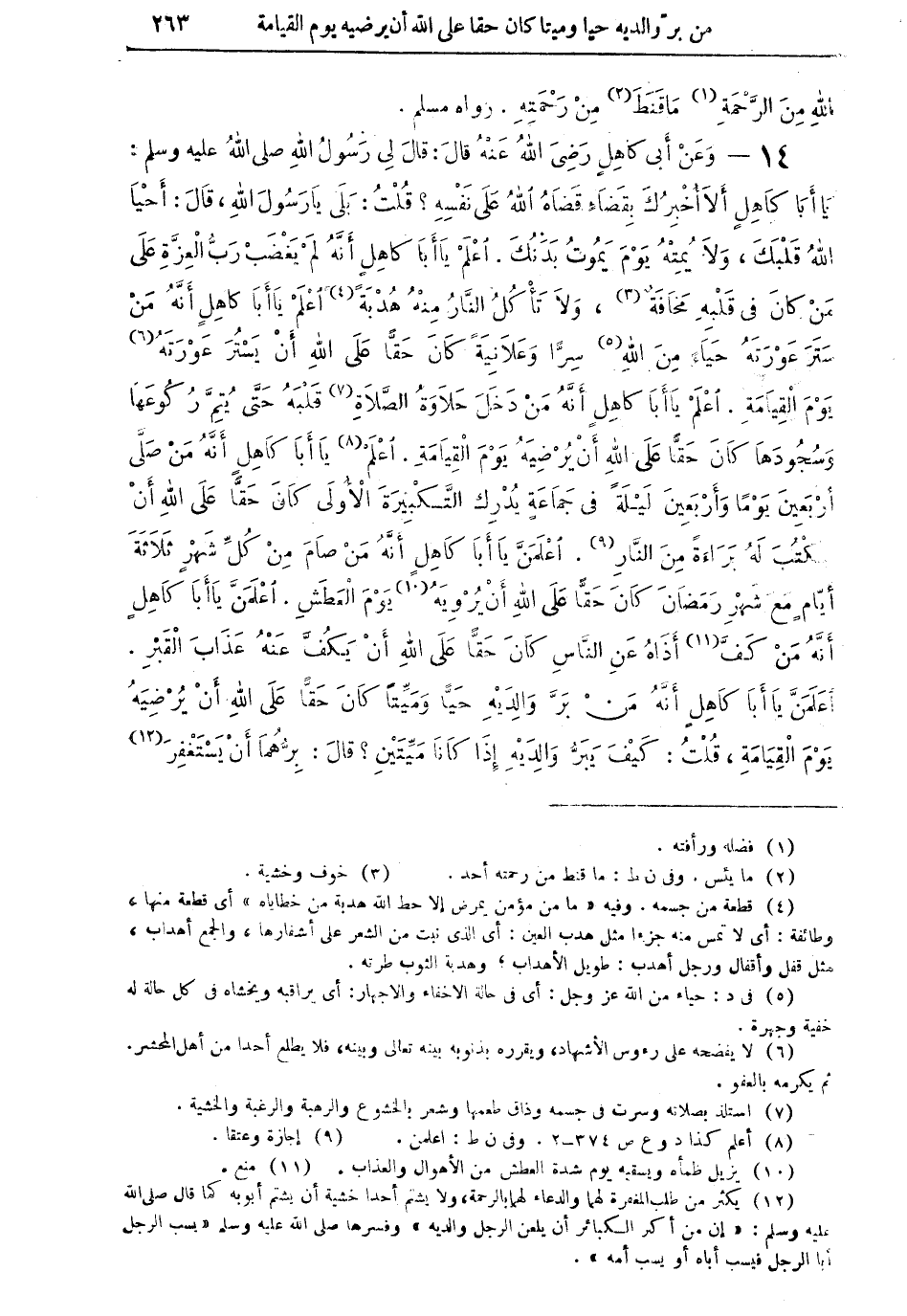 14 - وَعَنْ أَبي كاهِلٍ رَضِيَ اللهُ عَنْهُ قالَ: قالَ لِي رَسُولُ اللهِ صلى اللهُ عليه وسلم: يَا أَبَا كاهِلٍ أَلاَ أُخْبِرُكَ بِقَضَاءٍ قَضَاهُ اللهُ عَلَى نَفْسِهِ؟ قُلْتُ: بَلَى يَا رَسُولَ اللهِ، قالَ: أَحْيَا اللهُ قَلْبَكَ، وَلاَ يُمِتْهُ يَوْمَ يَمُوتُ بَدَنُكَ. اعْلَمْ يَا أَبَا كاهِلٍ أَنَّهُ لَمْ يَغْضَبْ رَبُّ الْعِزَّةِ عَلَى مَنْ كانَ فِي قَلْبِهِ مَخَافَةٌ (¬3)، وَلاَ تَأْكُلُ النَّارُ مِنْهُ هُدْبَةً (¬4) اعْلَمْ يَا أَبَا كاهِلٍ أَنَّهُ مَنْ سَتَرَ عَوْرَتَهُ حَيَاءً مِنَ اللهِ (¬5) سِرّاً وَعَلانِيَةً كانَ حَقّاً عَلَى اللهِ أَنْ يَسْتُرَ عَوْرَتَهُ (¬6) يَوْمَ الْقِيَامَةِ. اعْلَمْ يَا أَبَا كَاهِلٍ أَنّهُ مَنْ دَخَلَ حَلاَوَةَ الصَّلاَةِ (¬7) قَلْبَهُ حَتَّى يُتِمَّ رُكُوعَهَا وَسُجُودَهَا كانَ حَقّاً على اللهِ أَنْ يُرْضِيَهُ يَوْمَ الْقِيَامَةِ. اعْلَمْ (¬8)