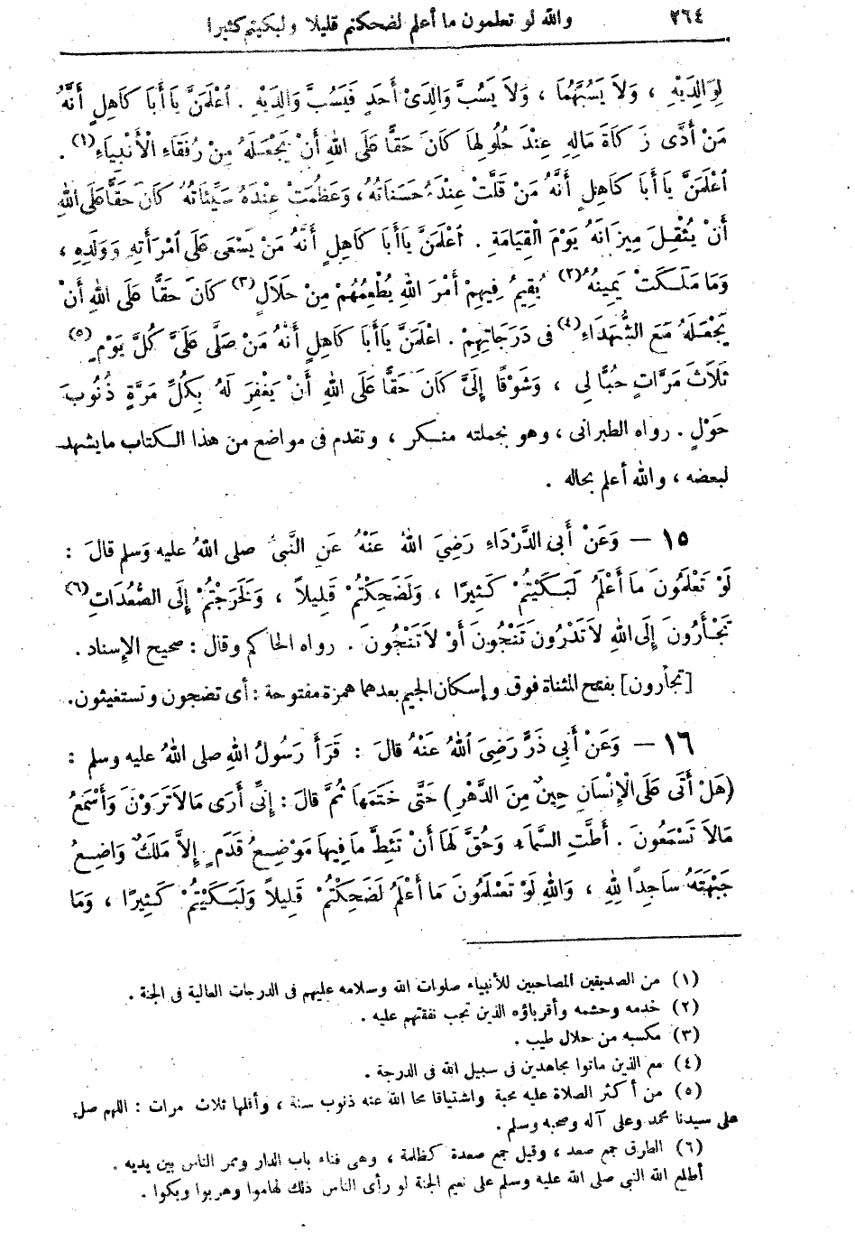 15 - وَعَنْ أَبِي الدَّرْدَاءِ رَضِيَ اللهُ عَنْهُ عَنِ النَّبيِّ صلى اللهُ عليه وسلم قالَ: لَوْ تَعْلَمُونَ مَا أَعْلَمُ لَبَكَيْتُمْ كَثِيراً، وَلَضَحِكْتُمُ قَلِيلاً، وَلَخَرَجْتُمْ إِلَيَّ الصُّعُدَاتِ (¬6) تَجْأَرُونَ إِلى اللهِ لاَ تَدْرُونَ تَنْجُونَ أَوْ لاَ تَنْجُونَ. رواه الحاكم وقال: صحيح الإسناد.