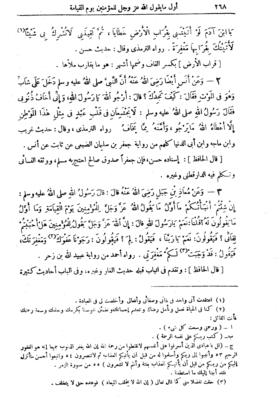 3 - وَعَنْ مُعَاذِ بْنِ جَبَلٍ رَضِي اللهُ عَنْهُ قالَ: قالَ رَسُولُ اللهِ صلى اللهُ عليه وسلم: إِنْ شِئْتُمْ أَنْبَأْتُكُمْ مَا أَوَّلُ مَا يَقُولُ اللهُ عَزَّ وَجَلَّ لِلْمُؤْمِنينَ يَوْمَ الْقِيَامَةِ وَمَا أَوَّلُ مَا يقُولُونَ لَه؟ قُلْنَا: نَعَمْ يَا رَسُولَ اللهِ قالَ: إِنَّ اللهَ عَزَّ وَجَلَّ يَقُولُ لِلْمُؤْمِنينَ هَلْ أَحْبَبْتُمْ لِقَائِي؟ فَيَقُولُونَ: نَعَمْ يَا رَبَّنَا، فَيَقُولُ: لِمَ؟ فَيَقُولُونَ: رَجَوْنَا عَفْوَكَ (¬2)