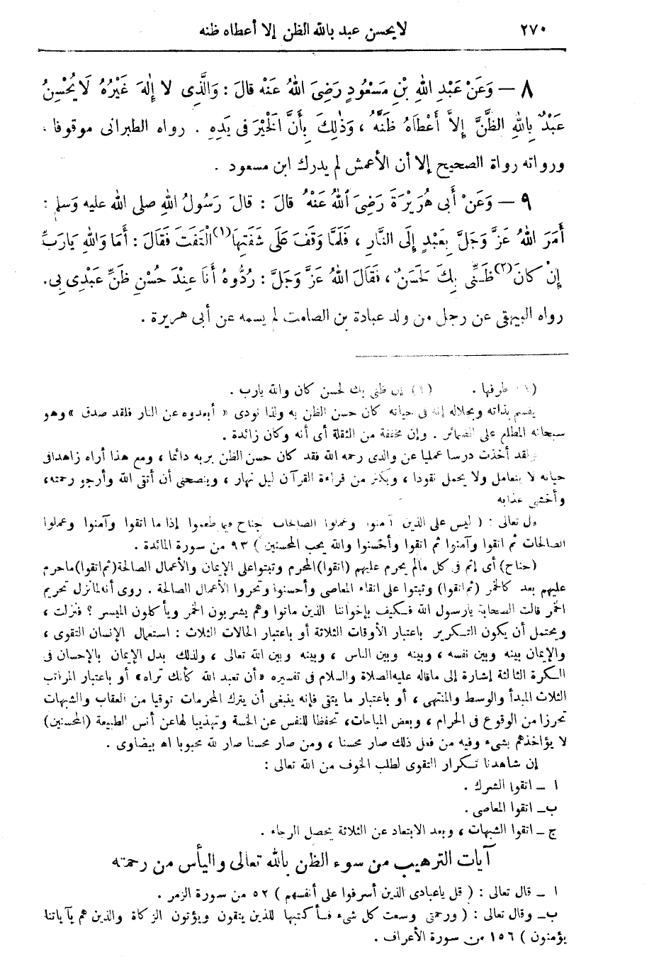 8 - وَعَنْ عَبْدِ اللهِ بْنِ مَسْعُودٍ رَضِيَ اللهُ عَنْهُ قالَ: وَالَّذِي لاَ إِلهَ غَيْرُهُ لاَ يُحْسِنُ عَبْدٌ باللهِ الظَّنَّ إِلاَّ أَعْطَاهُ ظَنّهُ، وَذَلِكَ بِأَنَّ الْخَيْرَ في يَدِهِ رواه الطبراني موقوفاً، ورواته رواة الصحيح إلا أن الأعمش لم يدرك ابن مسعود.