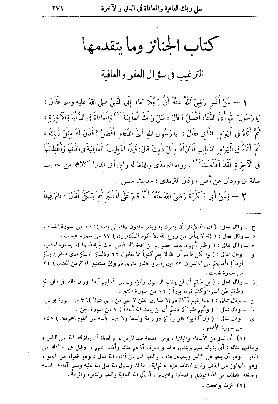 (¬1) أن تسلم من الأسقام والبلايا، وهي الصحة ضد المرض، والمعافاة أن يعافيك الله من الناس، ويعافيهم منك: أي يغنيك عنهم ويغنيهم عنك ويصرف أذاهم عنك وأذاك عنهم، وقيل هي مفاعلة من العفو، وهو أن يعفو عن الناس ويعفوا هم عنه. والعفو اسم من أسماء الله تعالى، وهو فعول من العفو، وهو التجاوز عن الذنب وترك العقاب عليه أهـ نهاية. يعلمك رسول الله صلى الله عليه وسلم آداب الدعاء وصيغته فتطلب من الله التوفيق والسعادة والتيسير. أسأل الله العافية والعفو والمغفرة والرحمة.