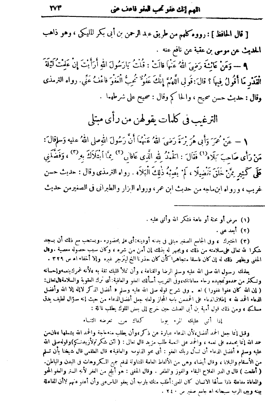 9 - وَعَنْ عَائِشَةَ رَضِيَ اللهُ عَنْهَا قالَتْ: قُلْتُ يَا رَسُولَ اللهِ أَرَأَيْتَ إِنْ عَلِمْتُ لَيْلَةَ الْقَدْرِ مَا أَقُولُ فِيهَا؟ قالَ: قُولِي اللَّهُمَّ إِنَّكَ عَفُوٌّ تُحِبُّ الْعَفْوَ فَاعْفُ عَنِّي. رواه الترمذي وقال حديث حسن صحيح، والحاكم وقال: صحيح على شرطهما.