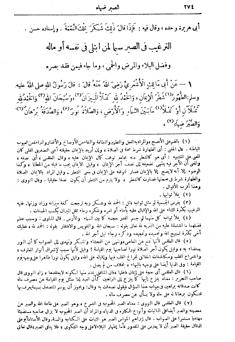 1 - عَنْ أَبي مَالِكٍ الأَشْعَرِيِّ رَضِيَ اللهُ عَنْهُ قالَ: قالَ رَسُولُ اللهِ صلى اللهُ عليه وسلم: الطُّهُورُ (¬1) شَطْرُ الإِيْمَانِ، وَالْحَمْدُ للهِ تَمْلأُ الْمِيزَانَ (¬2)، وَسُبْحَانَ اللهِ (¬3) وَالْحَمْدُ للهِ تَمْلآنِ أَوْ تَمْلأُ (¬4)
