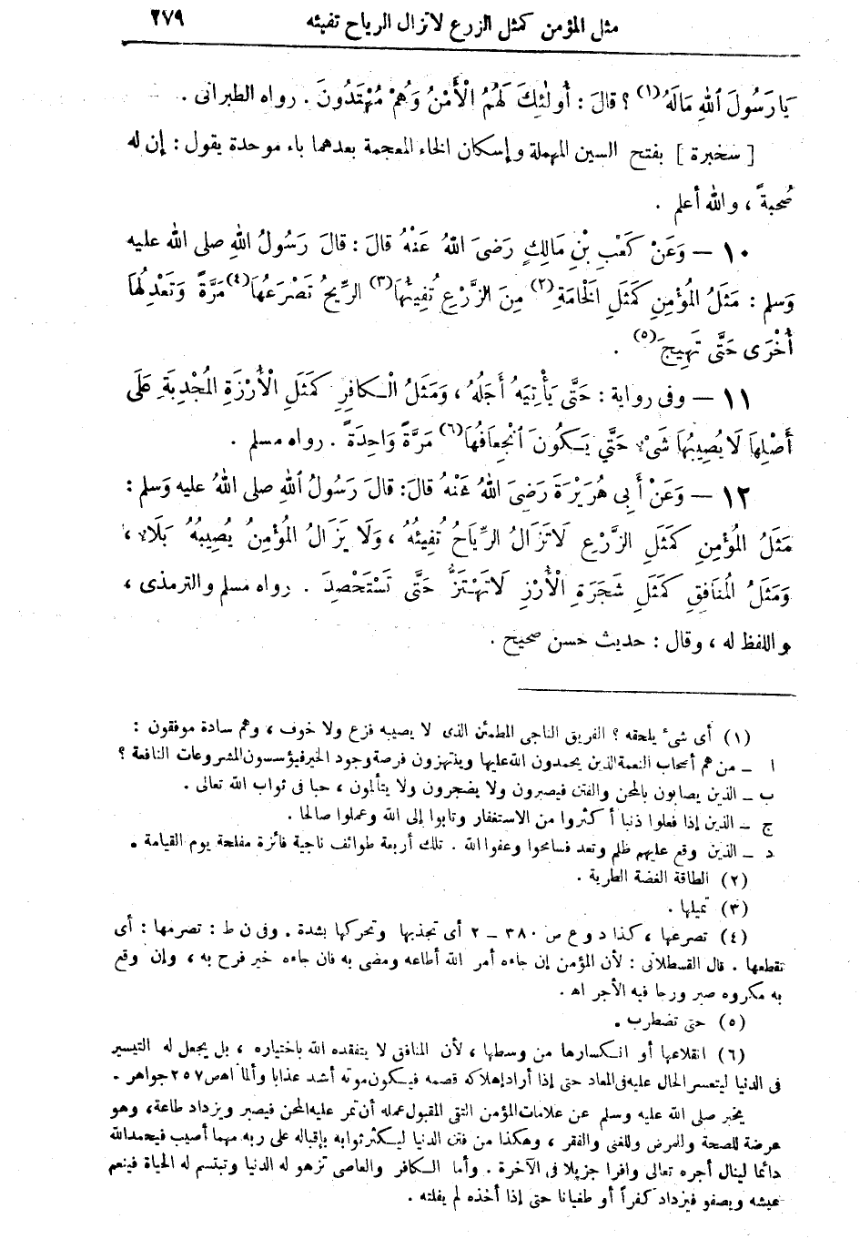 12 - وَعَنْ أَبِي هُرَيْرَةَ رَضِيَ اللهُ عَنْهُ قالَ: قالَ رَسُولُ اللهِ صلى اللهُ عليه وسلم: مَثَلُ الْمُؤْمِنِ كَمَثَلِ الزَّرْعِ لاَ تَزَالُ الرِّيَاحُ تفِيئُهُ، وَلاَ يَزَالُ الْمُؤْمِنُ يُصِيبُهُ بَلاءٌ، وَمَثَلُ الْمُنَافِقِ كَمَثَلِ شَجَرَةِ الأُرْزِ لاَ تَهْتَزُّ حَتّى تَسْتَحْصِدَ. رواه مسلم والترمذي، واللفظ له، وقال: حديث حسن صحيح: