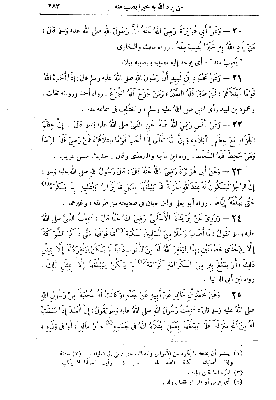 25 - وَعَنْ مُحَمّدِ بْنِ خَالِدٍ عَنْ أَبِيهِ عَنْ جَدِّهِ، وَكَانَتْ لَهُ صُحْبَةٌ مِنْ رَسُولِ اللهِ صلى اللهُ عليه وسلم قالَ: سَمِعْتُ رَسُولَ اللهِ صلى اللهُ عليه وسلم يَقُولُ: إِنَّ الْعَبْدَ إِذَا سَبَقَتْ لَهُ مِنَ اللهِ مَنْزِلَةٌ فَلَمْ يَبْلُغْهَا بِعَمَلٍ ابْتَلاهُ اللهُ في جَسَدِهِ (¬4)، أَوْ مَالِهِ، أَوْ في وَلَدِهِ، ثُمَّ