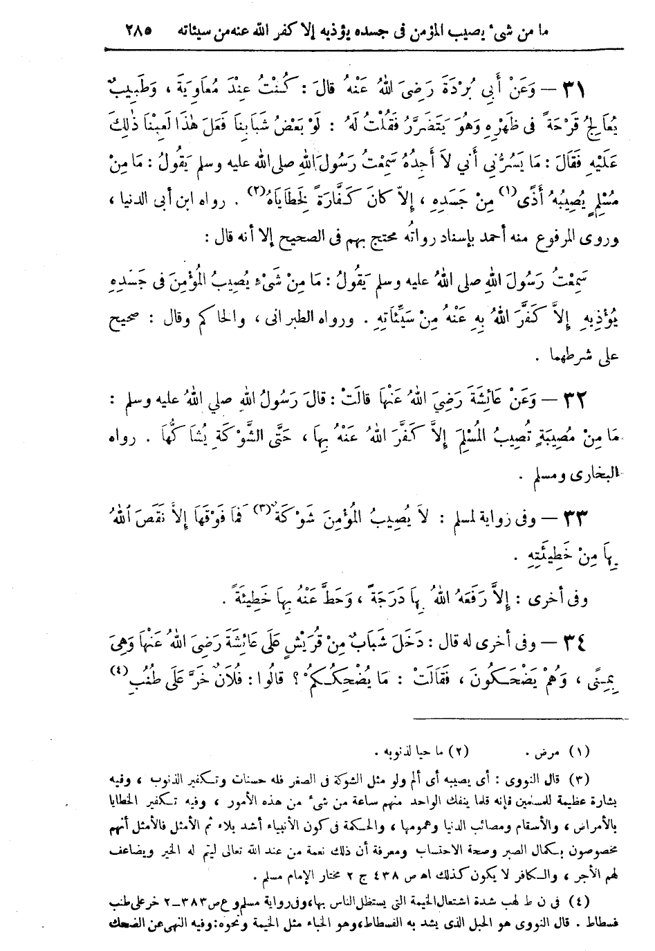 33 - وفي رواية مسلم: لا يُصِيبُ الْمُؤْمِنُ شَوْكَةٌ (¬3) فَمَا فَوْقَهَا إِلاَّ نَقَصَ اللهُ بِهَا مِنْ خَطِيئَتِهِ.