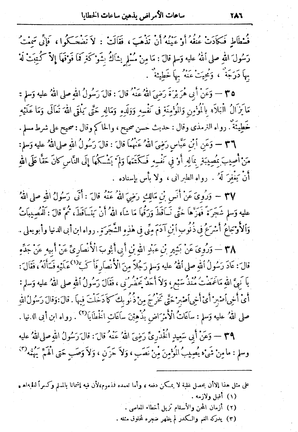 38 - وَرُوِيَ عَنْ بَشِيرِ بْنِ عَبْدِ اللهِ بْنِ أَبي أَيُّوبَ الأَنْصَارِيِّ عَنْ أَبِيهِ عَنْ جَدِّهِ قالَ: عَادَ رَسُولُ اللهِ صلى اللهُ عليه وسلم رَجُلاً مِنَ الأَنْصَارِ فَأَكَبَّ (¬1) عَلَيْهِ فَسَأَلَهُ، فَقَالَ: يَا نَبِيَّ اللهِ مَا غَمَضْتُ مُنْذُ سِبْعٍ، وَلاَ أَحَدٌ يَحْضُرُنِي، فَقَالَ رَسُولُ اللهِ صلى اللهُ عليه وسلم: أَيْ أَخِي اصْبِرْ أَيْ أَخِي اصْبِرْ حَتَّى تَخْرُجَ مِنْ ذُنُوبِكَ كَمَا دَخَلْتَ فِيهَا. قالَ: وقالَ رَسُولُ اللهِ صلى اللهُ عليه وسلم: سَاعَاتُ الأَمْرَاضِ يُذْهِبْنَ سَاعَاتِ الْخَطَايَا (¬2). رواه ابن أبي الدنيا.