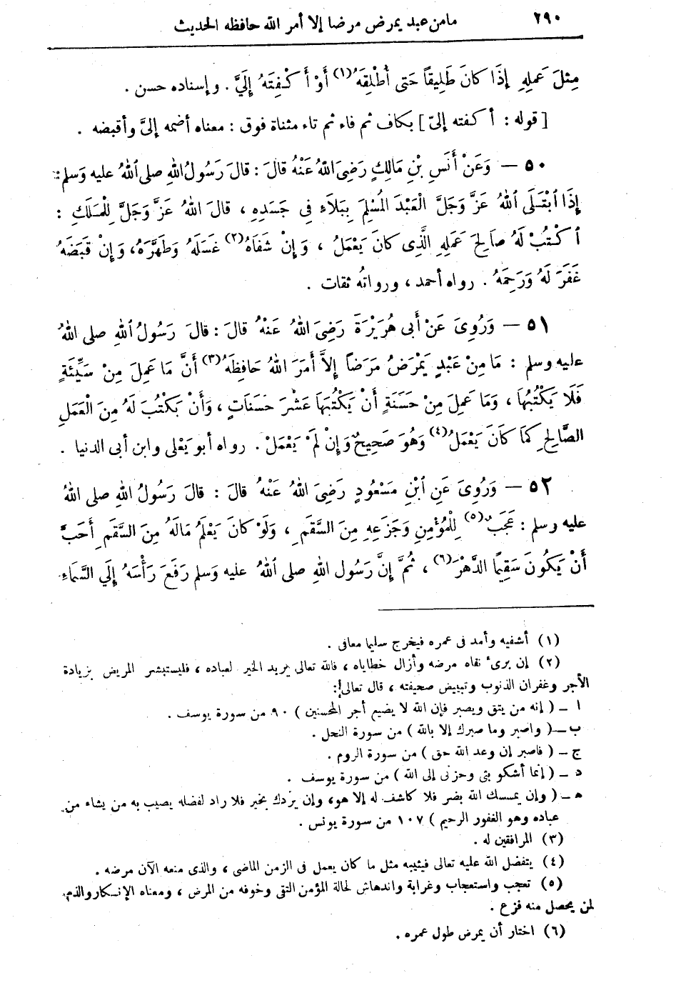 52 - وَرُوِيَ عَنِ ابْنِ مَسْعُودٍ رَضِيَ اللهُ عَنْهُ قالَ: قالَ رَسُولُ اللهِ صلى اللهُ عليه وسلم: عَجَبٌ (¬5) لِلْمُؤْمِنِ وَجَزَعِهِ مِنَ السَّقَمِ، وَلَوْ كَانَ يَعْلَمُ مَا لَهُ مِنَ السَّقَمِ أَحَبَّ أَنْ يَكُونَ سَقِيماً الدَّهْرَ (¬6)، ثُمَّ إِنَّ رَسُولَ اللهِ صلى اللهُ عليه وسلم رَفَعَ رَأْسَهُ إِلى السَّمَاءِ فَضَحِكَ