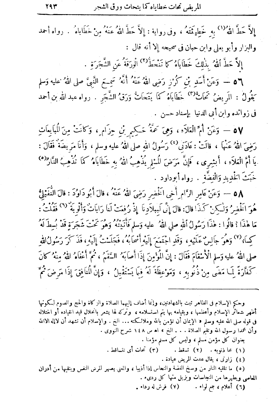 56 - وَعَنْ أَسَدِ بْنِ كُرْزٍ رَضِيَ اللهُ عَنْهُ أَنَّهُ سَمِعَ النَّبِيَّ صلى اللهُ عليه وسلم يَقُولُ: المرِيضُ تَحَاتُّ (¬3) خَطَايَاهُ كما يَتَحَاتُّ وَرَقُ الشَّجَرِ. رواه عبد الله بن أحمد في زوائده وابن أبي الدنيا بإسناد حسن.