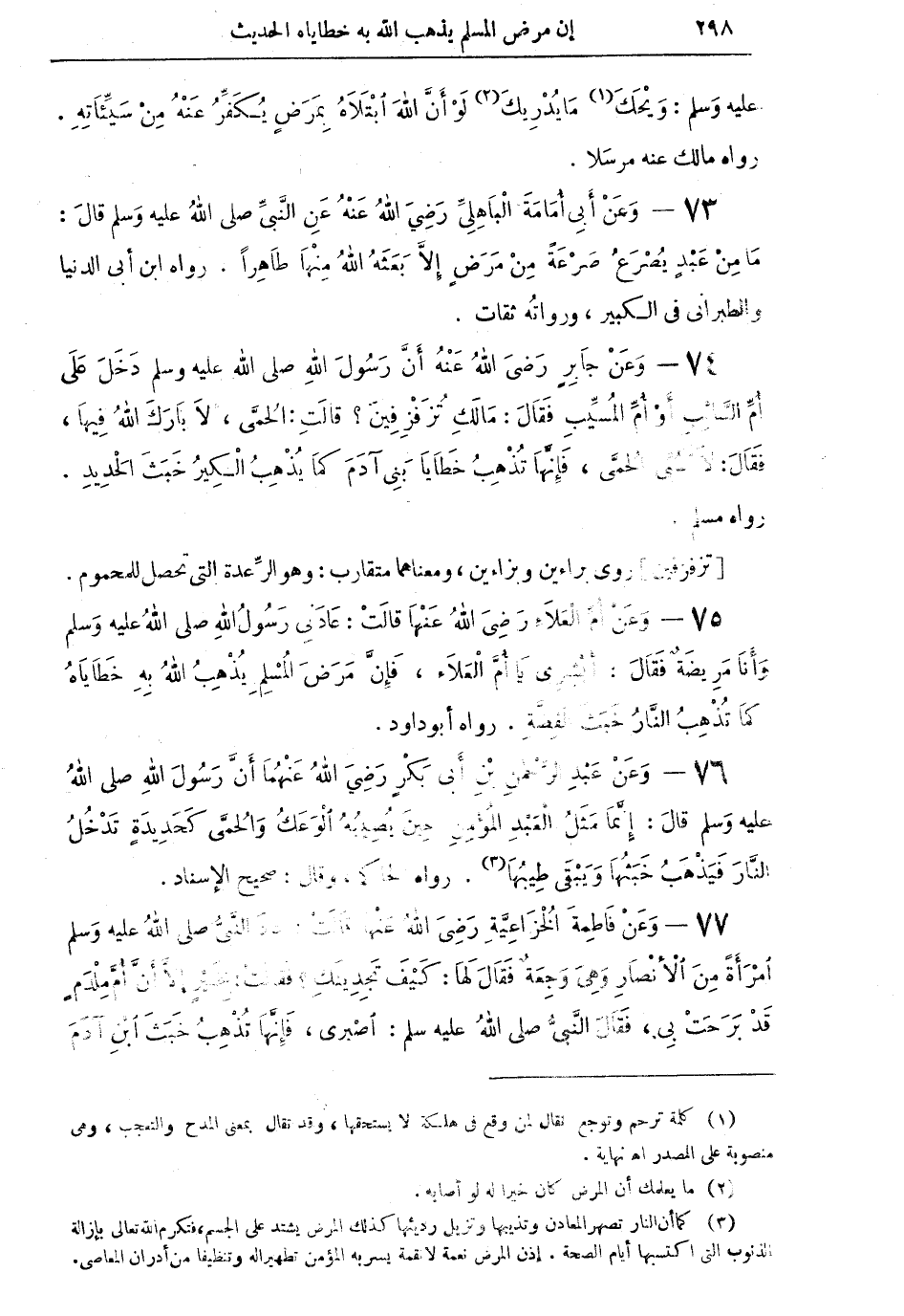 74 - وَعَنْ جَابِرٍ، رَضِيَ اللهُ عَنْهُ أَنَّ رَسُولَ اللهِ صلى اللهُ عليه وسلم دَخَلَ عَلَى أُمِّ السَّائِبِ أَوْ أُمِّ الْمُسَيِّبِ فَقَالَ: مَا لَكِ تُزَفْزِفِينَ؟ قالَتِ: الْحُمَّى، لاَ بَارَكَ اللهُ فِيهَا، فَقَالَ: لاَ تَسُبِّي الْحُمَّى، فَإِنَّهَا تُذْهِبُ خَطَايَا بَنِي آدَمَ كَما يُذْهِبُ الْكِيرُ خَبَثَ الْحَدِيدِ. رواه مسلم.