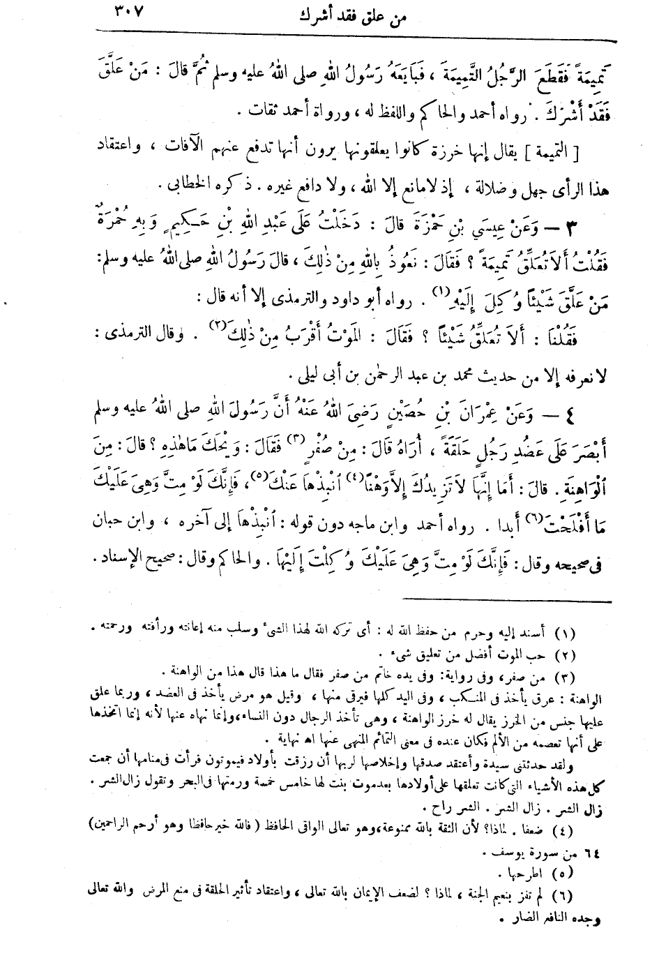 تَمِيمَةً فَقَطَعَ الرَّجُلُ التَّمِيمَةَ، فَبَايَعَهُ رَسُولُ اللهِ صلى اللهُ عليه وسلم ثُمَّ قالَ: مَنْ عَلَّقَ فَقَدْ أَشْرَكَ. رواه أحمد والحاكم واللفظ له، ورواة أحمد ثقات.