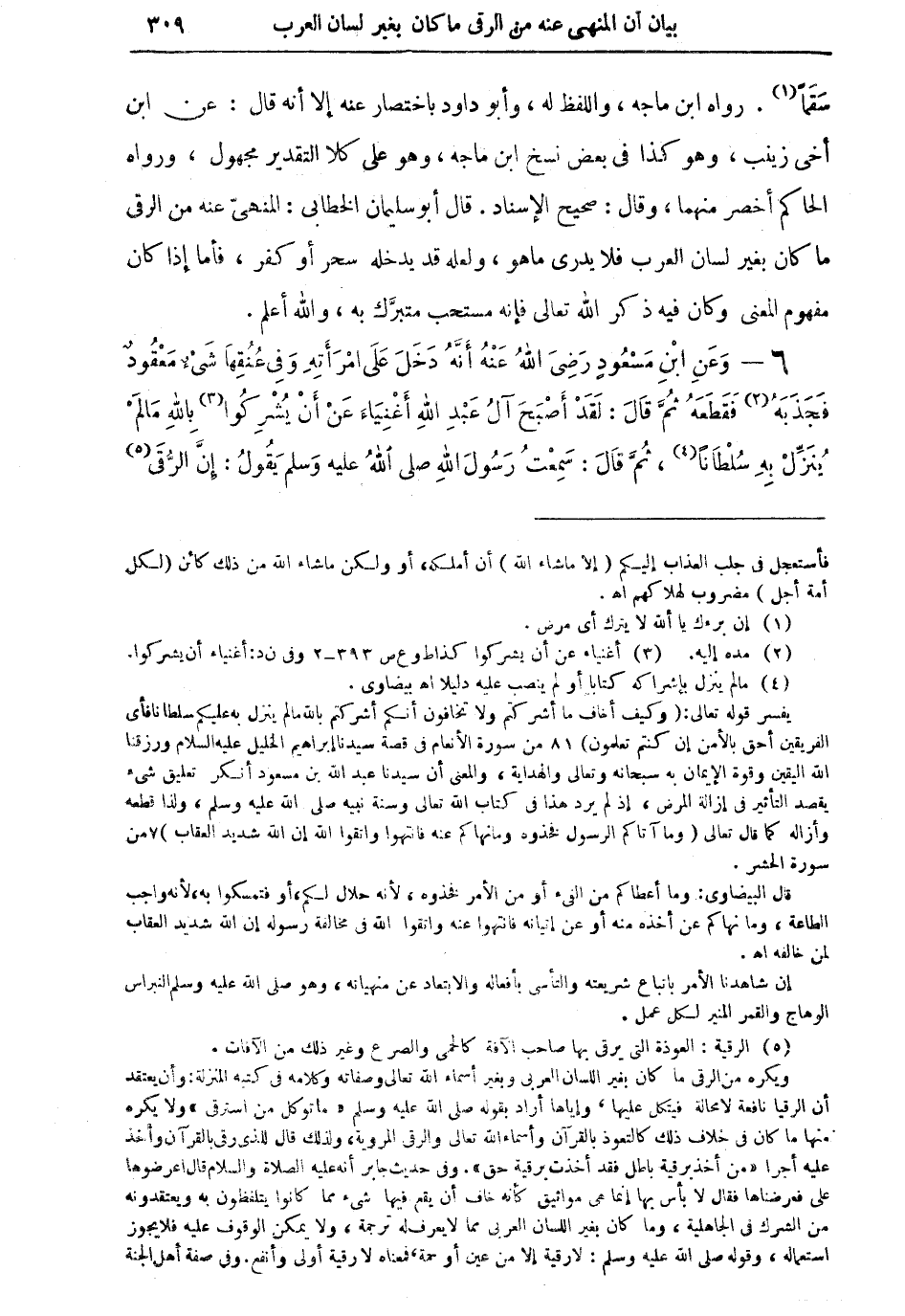 6 - وَعَنِ ابْنِ مَسْعُودٍ رَضِيَ اللهُ عَنْهُ أَنَّهُ دَخَلَ عَلَى امْرَأَتِهِ وَفِي عُنُقِهَا شَيْءٌ مَعْقُودٌ فَجَذَبَهُ (¬2) فَقَطَعَهُ ثُمَّ قالَ: لَقَدْ أَصْبَحَ آلُ عَبْدِ اللهِ أَغْنِيَاءَ عَنْ أَنْ يُشْرِكُوا (¬3) بِاللهِ مَا لَمْ يُنَزِّلْ بِهِ سُلْطَاناً (¬4)، ثُمَّ قالَ: سَمِعْتُ رَسُولَ اللهِ صلى اللهُ عليه وسلم يَقُولُ: إِنَّ الرُّقَى (¬5)