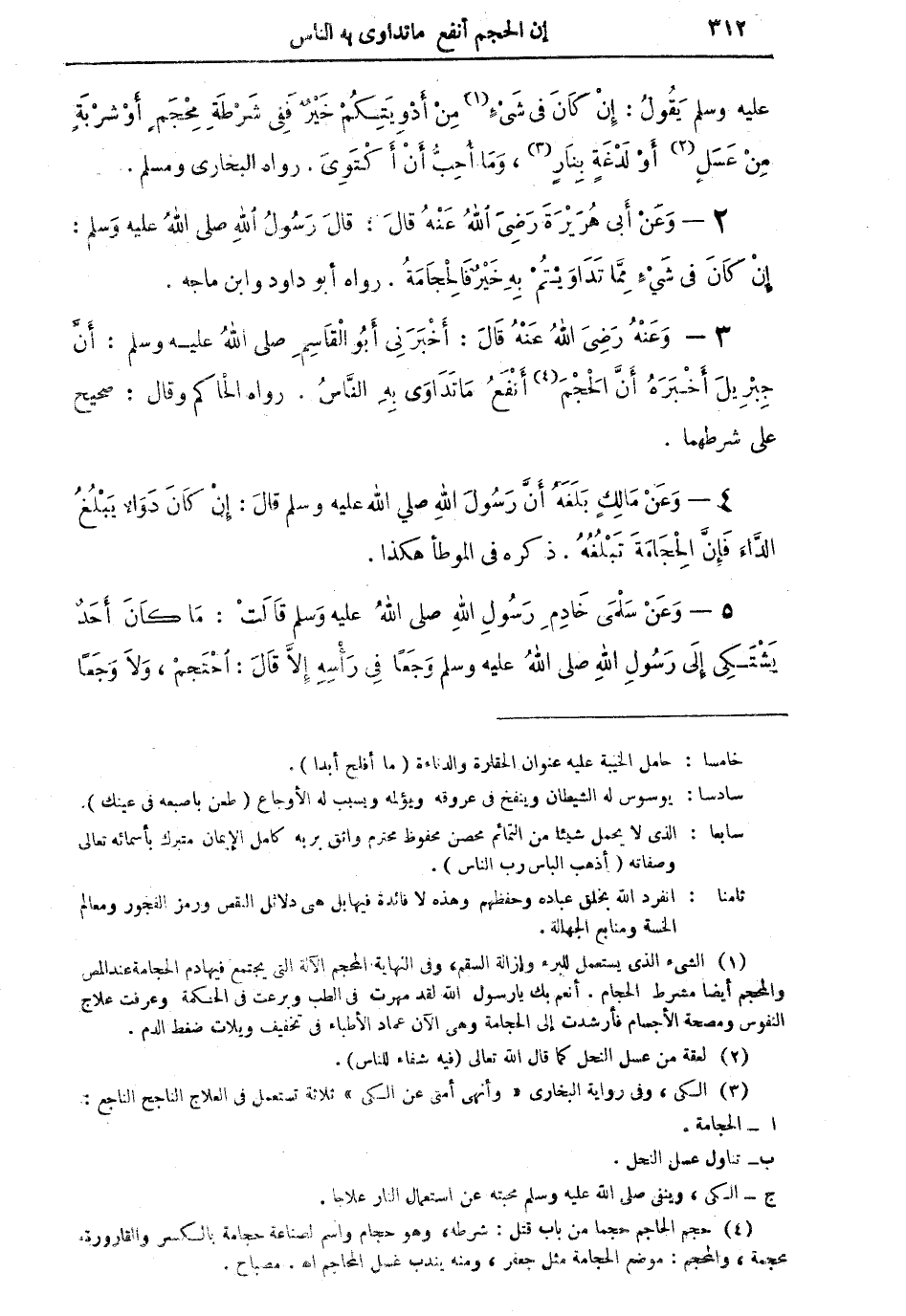 (¬1) الشيء الذي يستعمل للبرء وإزالة السقم، وفي النهاية المحجم الآلة التي يجتمع فيها دم الحجامة عند المص والمحجم أيضاً مشرط الحجام. أنعم بك يا رسول الله لقد مهرت في الطب وبرعت في الحكمة وعرفت علاج النفوس ومصحة الأجسام فأرشدت إلى الحجامة وهي الآن عماد الأطباء في تخفيف ويلات ضغط الدم.