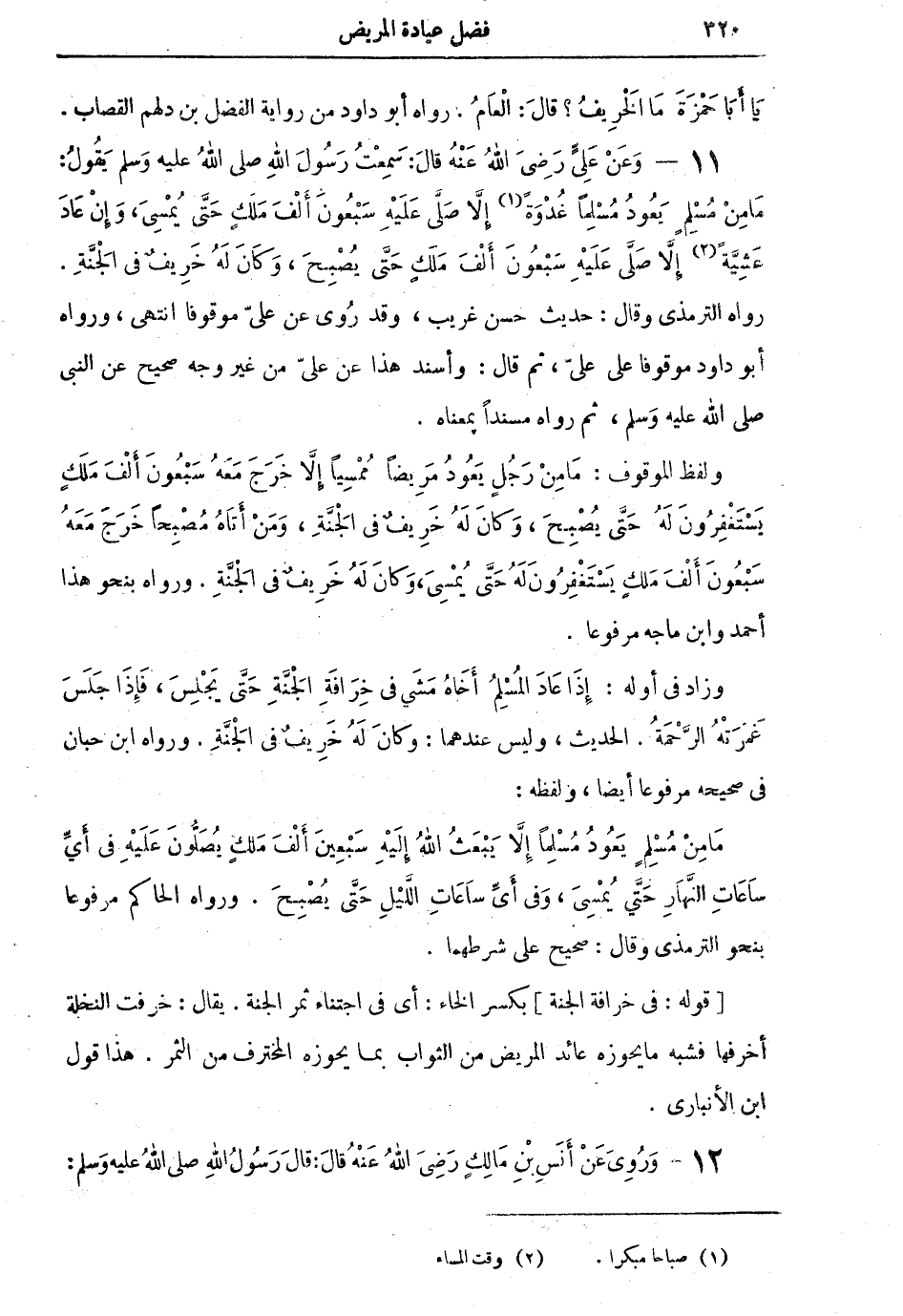 مَا مِنْ مُسْلِمٍ يَعُودُ مُسْلِمَاً إِلاَّ يَبْعَثُ اللهُ إِلَيْهِ سَبْعِينَ أَلْفَ مَلَكٍ يُصَلُّونَ عَلَيْهِ في أَيِّ سَاعَاتِ النَّهَارِ حَتَّى يُمْسِيَ، وفي أَيِّ سَاعَاتِ اللَّيْلِ حَتَّى يُصْبِحَ. وَرواه الحاكم مرفوعاً بنحو الترمذي وقال: صحيح على شرطهما.