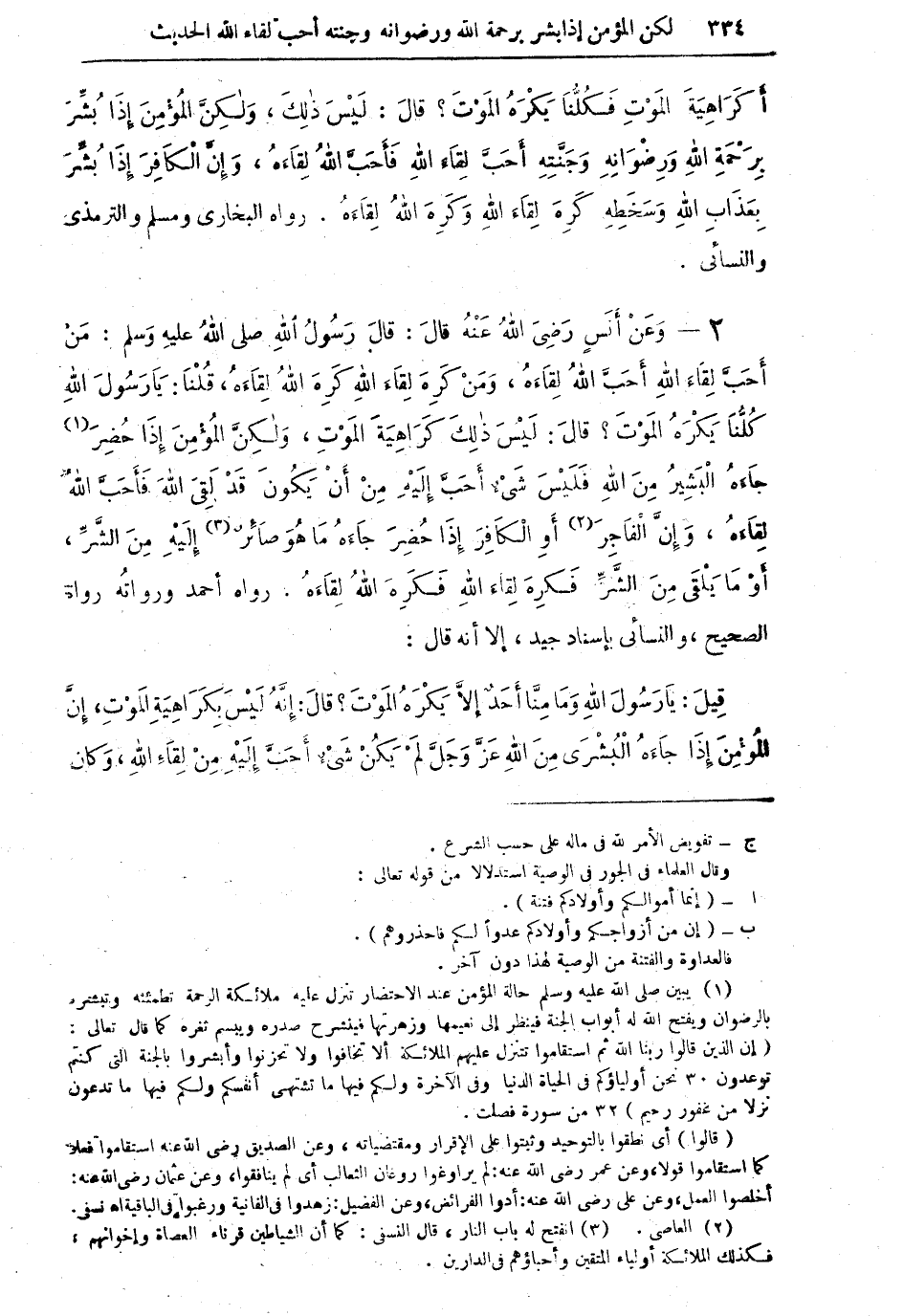 قِيلَ: يَا رَسُولَ اللهِ وَمَا مِنَّا أَحَدق إِلاَّ يَكْرَهُ الْمَوْتَ؟ قالَ: إِنَّهُ لَيْسَ بِكَرَاهِيَةِ الْمَوْتِ، إِنَّ الْمُؤْمِنَ إِذَا جَاءَهُ الْبُشْرَى مِنَ اللهِ عَزَّ وَجَلَّ لَمْ يَكُنْ شَيْءٌ أَحَبَّ إِلَيْهِ مِنْ لِقَاءِ اللهِ، وَكَانَ