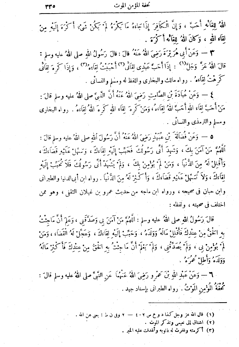 6 - وَعَنْ عَبْدِ اللهِ بْنِ عَمْروٍ رَضِيَ اللهُ عَنْهُمَا عَنِ النَّبِيِّ صلى اللهُ عليه وسلم قالَ: تُحْفَةُ الْمُؤْمِنِ الْمَوْتُ. رواه الطبراني بإسناد جيد.
