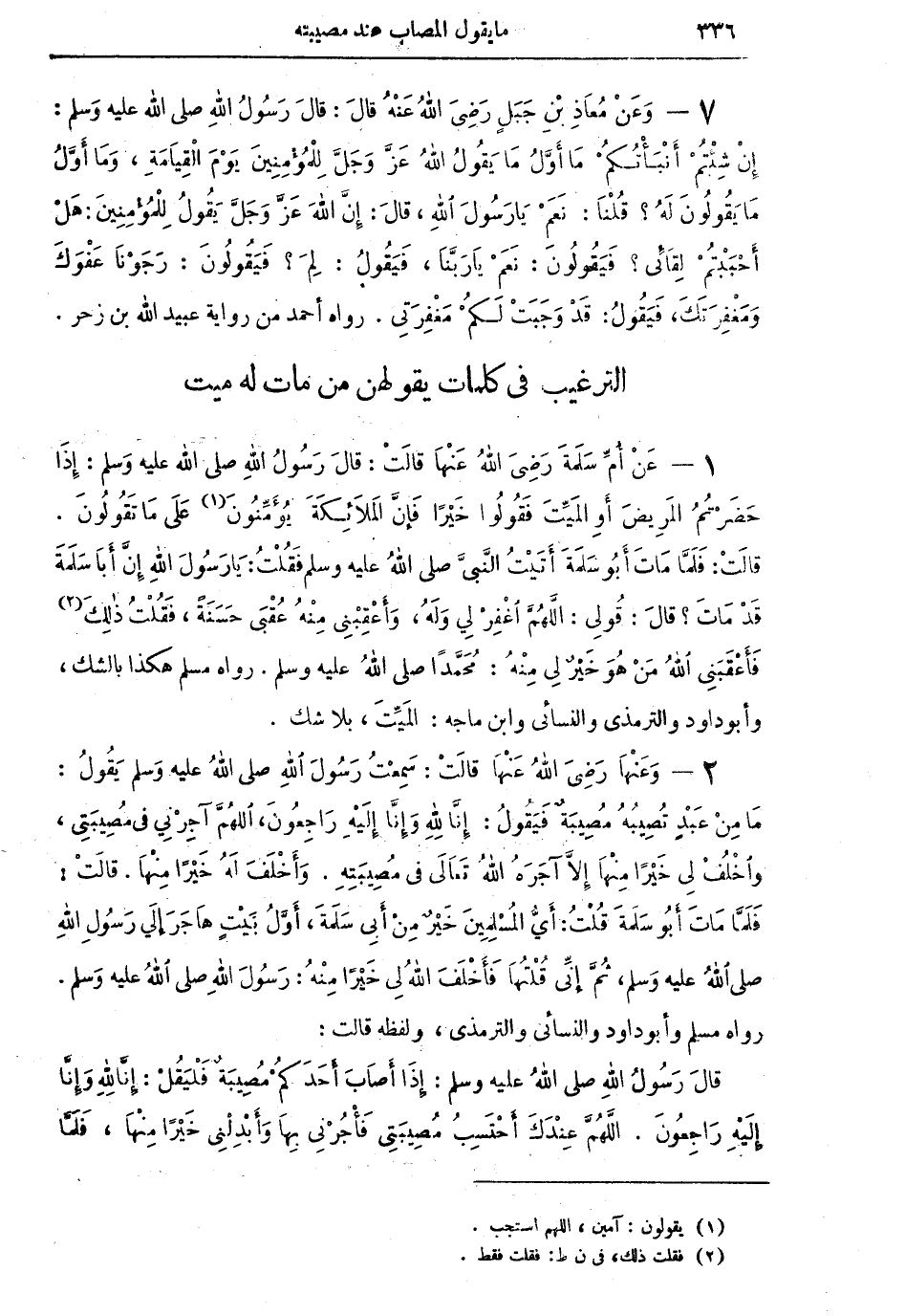 2 - وَعَنْهَا رَضِيَ اللهُ عَنْهَا قالَتْ: سَمِعْتُ رَسُولَ اللهِ صلى اللهُ عليه وسلم يَقُولُ: مَا مِنْ عَبْدٍ تُصِيبُهُ مُصِيبَةٌ فَيَقُولُ: إِنَّا للهِ وَإِنَّا إِلَيْهِ رَاجِعُونَ: اللَّهُمَّ آجِرْنِي في مُصِيبَتي، وَاخْلُفْ لِي خَيْراً مِنْهَا مِنْهَا إِلاَّ آجَرَهُ اللهُ تَعَالَى في مُصِيبَتِهِ. وَأَخْلَفَ لَهُ خَيْراً مِنْهَا. قالَتْ: فَلَمَّا مَاتَ أَبُو سَلَمَةَ قُلْتُ: أَيُّ الْمُسْلِمِينَ خَيْرٌ مِنْ أَبِي سَلَمَةَ، أَوَّلُ بَيْتٍ هَاجَرَ إِلى رَسُولِ اللهِ صلى الله عليه وسلم، ثُمَّ إِنِّي قُلْتُهَا فَأَخْلَفَ اللهُ لِي خَيْراً مِنْهُ: رَسُولَ اللهِ صلى اللهُ عليه وسلم. رواه مسلم وابو داود والنسائي والترمذي، ولفظه قالت: